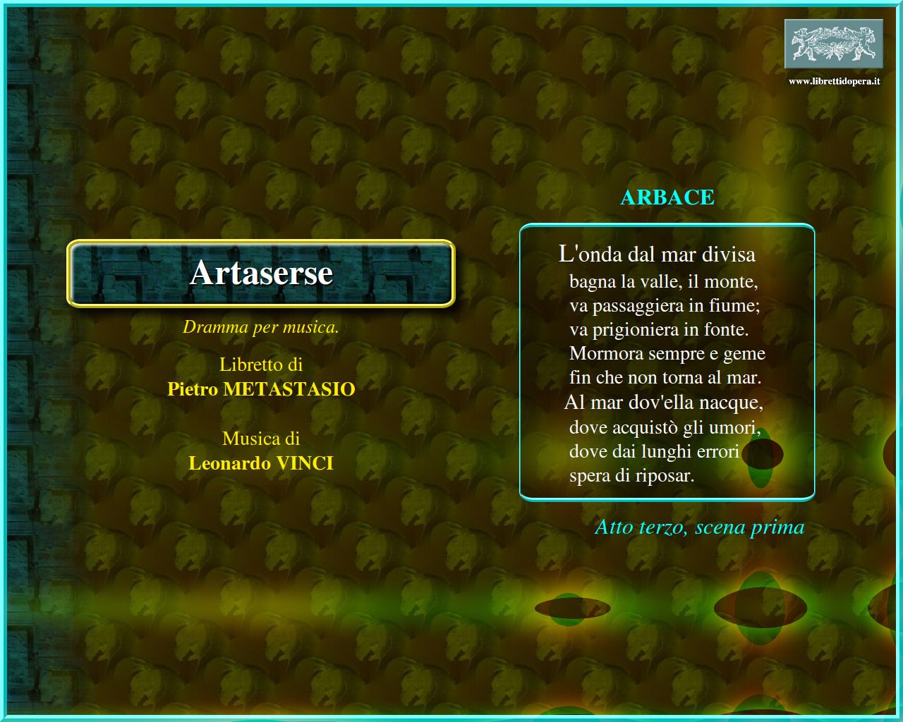 ⚫ Le situazioni sentimentali ideate da Metastasio trovano nella musica di Vinci (che durante gli anni della conoscenza reciproca a Napoli intonò ben sette testi del poeta) una corrispondenza ideale, che Metastasio non dimenticherà mai: melodie di incantevole bellezza in cui le voci di registro femminile possono esercitare il loro fascino, accompagnate da un’orchestra discreta che ne asseconda docilmente il gioco degli affetti. In particolare le arie di Arbace, il ‘primo uomo’ (allora il celebre Carestini), mostrano tutte – nell’aderenza al testo – una precisa caratterizzazione: dalla complessità della concitata aria di sortita “Fra cento affanni e cento” (I,2) alla maestosa imponenza descrittiva di quella popolarissima a conclusione del primo atto “Vo solcando un mar crudele” (I,15), al nitore pieno di grazia dell’aria “L’onda dal mar divisa” (III,1). L’Artaserse di Vinci – ripreso per quattro stagioni a Napoli (fino al 1743), esaltato da Charles de Brosses – fu uno dei pochissimi titoli di opera seria a guadagnarsi una diffusione vasta e durevole nel primo Settecento, contribuendo in modo decisivo alla fama postuma del suo autore.