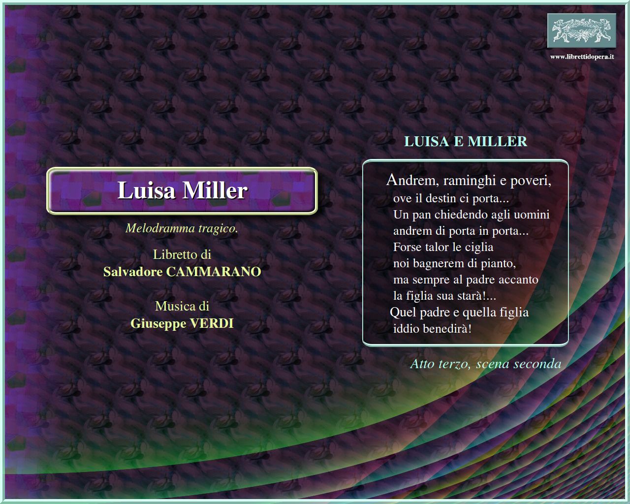 ⚫ Nell’estate del 1848 Verdi, dal suo soggiorno parigino, fece diversi tentativi per rescindere un contratto per un’opera nuova, vecchio di tre anni, con il San Carlo di Napoli. L’impresa non volle però sentir ragioni e minacciò di rivalersi sul poeta residente del teatro, Salvatore Cammarano, che avrebbe dovuto preparare il libretto. Cammarano, cagionevole di salute e in condizioni finanziarie tutt’altro che floride, scrisse allora a Verdi implorandolo di rinnovare il contratto per l’anno successivo e il compositore acconsentì, pur controvoglia […]. Dopo che diversi soggetti erano stati scartati, nella primavera del 1849 Cammarano propose Kabale und Liebe (Amore e raggiro) di Schiller, un testo che già in precedenza aveva suscitato l’interesse di Verdi. La fitta corrispondenza tra compositore e librettista, che caratterizzò i mesi successivi, evidenzia non pochi contrasti e dubbi sull’adattamento librettistico. Soltanto verso la fine dell’estate Verdi rientrò a Busseto per comporre la musica dell’opera, che nel frattempo aveva mutato il suo titolo in Luisa Miller.