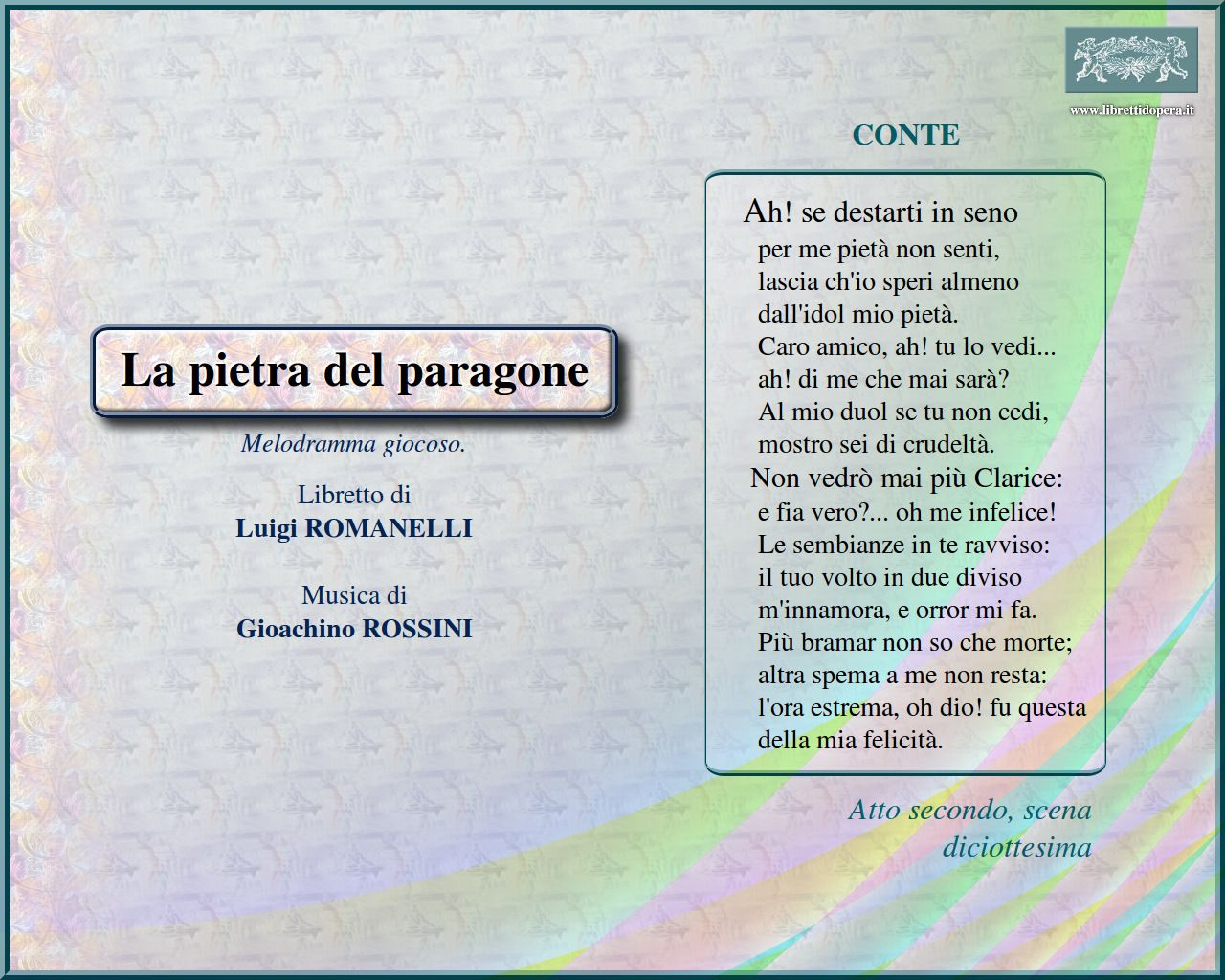 ⚫ La pietra del paragone è una vera e propria opera comica e non una farsa come La cambiale di matrimonio o L’inganno felice, pensati per il piccolo San Moisè veneziano. Rossini, volendo conquistare il sofisticato pubblico milanese, mette da parte i toni grotteschi e a volte sbrigativi per concentrarsi su un’opera di gusto ben calibrato e raffinato; la Pietra deve infatti il suo andamento agile e brillante anche ad atmosfere introspettive (come nella dichiarazione del conte nella sua ultima aria).