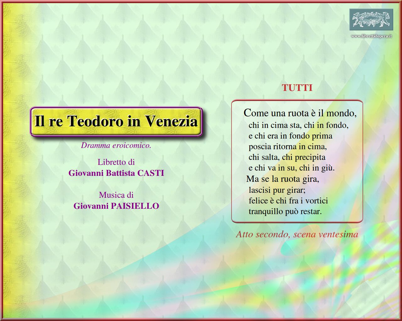 ⚫ Forzando la realtà storica, Casti fa finire Teodoro in prigione già a Venezia (su denuncia del geloso Sandrino) e non a Londra. Tutti i personaggi vanno a trovarlo e proclamano la morale della storia: «Come una ruota è il mondo/ chi in cima sta, chi in fondo/e chi era in fondo prima/ poscia ritorna in cima»; fino all’ultima disincantata affermazione: «felice chi tra i vortici/tranquillo può restar», alla quale si ispirerà Da Ponte nel finale di Così fan tutte. I debiti di Teodoro sono in realtà i veri protagonisti di una commedia fortemente radicata nella realtà sociale del Settecento e ricca di allusioni al commercio internazionale, a cambiali e titoli di banca.