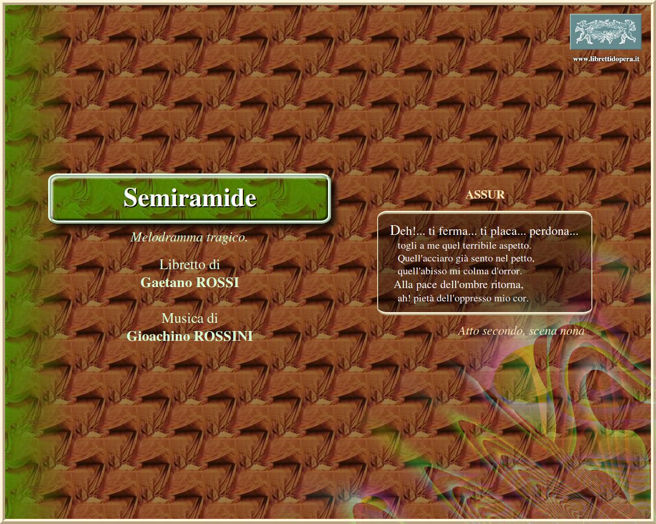⚫ Rossini iniziò a comporre la partitura di Semiramide nel novembre del 1822; aveva lasciato Napoli, definitivamente, e questo significava anche un necessario ripensamento del suo stile. Non poteva infatti pensare di esportare lo stile delle sue opere napoletane in un teatro, come la Fenice, che non sarebbe stato pronto ad accogliere un linguaggio stilisticamente così avanzato come quello adottato nei grandi capolavori di quel periodo. Dovette ripensare alla grande stagione di Tancredi, rappresentato sullo stesso palcoscenico della Fenice dieci anni prima: perciò stesso librettista, Gaetano Rossi, e stesso autore per la fonte del libretto, Voltaire. Librettista e compositore scelsero la tragedia Sémiramis, che elaborarono più dall’originale francese che dalla ottima versione datane da Melchiorre Cesarotti nel 1772.