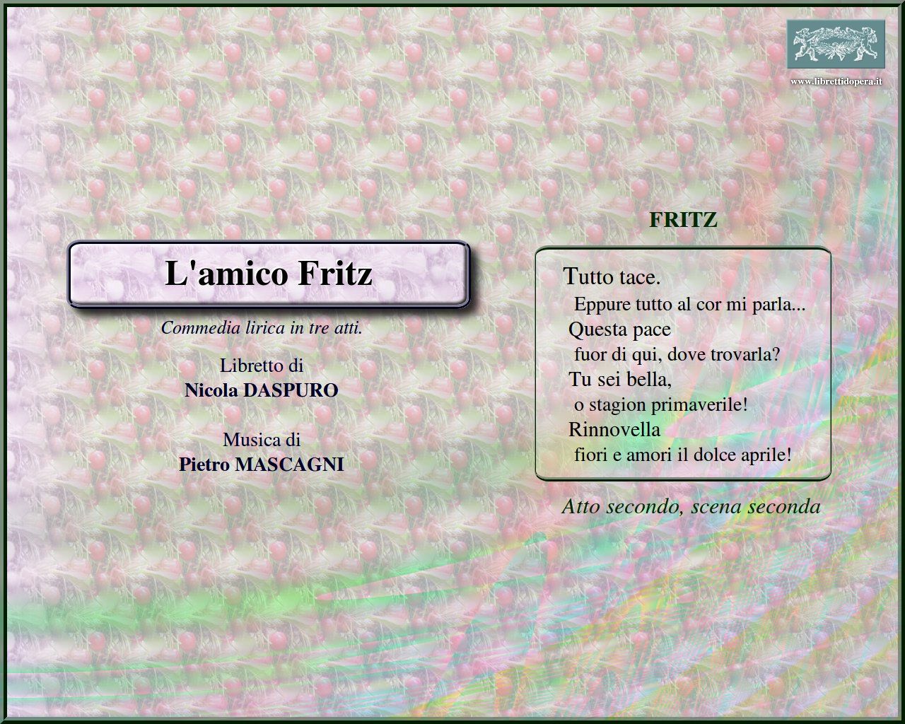 ⚫ Deliziosa ed esile, tutta melodia e sentimento, è questa un’opera che ebbe notevole e meritata fortuna, che tuttora prosegue: furba al punto giusto, e forse un po’ di più, con quel violino e quelle canzoni, tanto che proprio di quelle astuzie fu accusata. Ma non c’è accusa che tenga, e L’amico Fritz resta l’unica di Mascagni a far compagnia stabile a Cavalleria rusticana nel repertorio lirico, lontana da quei toni sanguigni, anche in orchestra, che avevano caratterizzato l’esordio del musicista livornese.