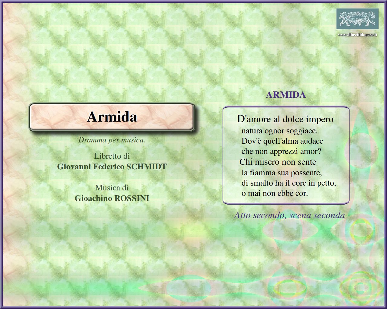 ⚫ […] La prima rappresentazione non fu un successo. L’opera sembrò infatti stravagante rispetto alla tradizione del melodramma italiano («Chiara la sua origine italo-alemanna», scrisse all’indomani della ‘prima’ il ‘Giornale delle due Sicilie’). In effetti Armida contiene molte pagine di impostazione nuova, a cominciare dall’introduzione orchestrale, certamente più moderna rispetto al modello messo a punto da Rossini negli anni precedenti. Anche “In quale aspetto imbelle”, un terzetto per tre tenori, dovette apparire una pagina singolare a un pubblico che pure non ignorava la tradizione operistica francese […].