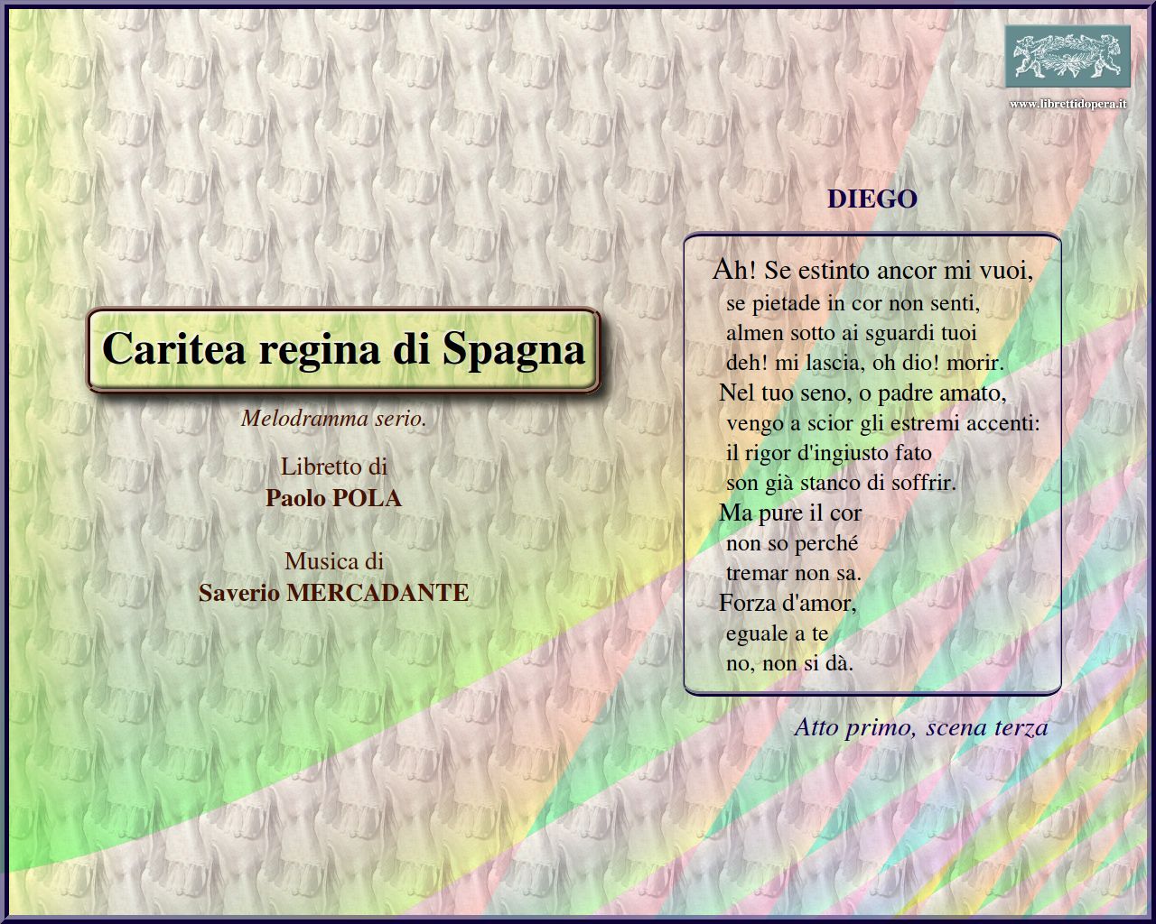 ⚫ Dopo l’affermazione milanese con Elisa e Claudio(1821), si inaugurò per Mercadante un decennio di viaggi per le capitali europee, durante il quale presentò le sue opere a Londra, Barcellona, Parigi, Vienna, Madrid e Lisbona. Per Venezia scrisse Caritea, regina di Spagna, che segnò un mutamento verso la scelta di soggetti più ‘moderni’ (una Caritea era già stata composta da Coccia, su libretto di Romani, Genova 1818), dopo il primo periodo caratterizzato dall’orientamento verso temi classici e rielaborazioni da Metastasio (con l’eccezione di pochi titoli quali Maria Stuart, Bologna 1821, Costanzo ed Almeriska, Napoli 1823) e da un linguaggio fortemente influenzato da Rossini. Rispetto a quel modello, evidente anche nell’uso del contralto en travesti, Caritea rivela mutamenti significativi: lo stile fiorito rossiniano è piegato alle esigenze dell’azione drammatica e regna un pathos lirico che preannuncia Bellini e Donizetti […]