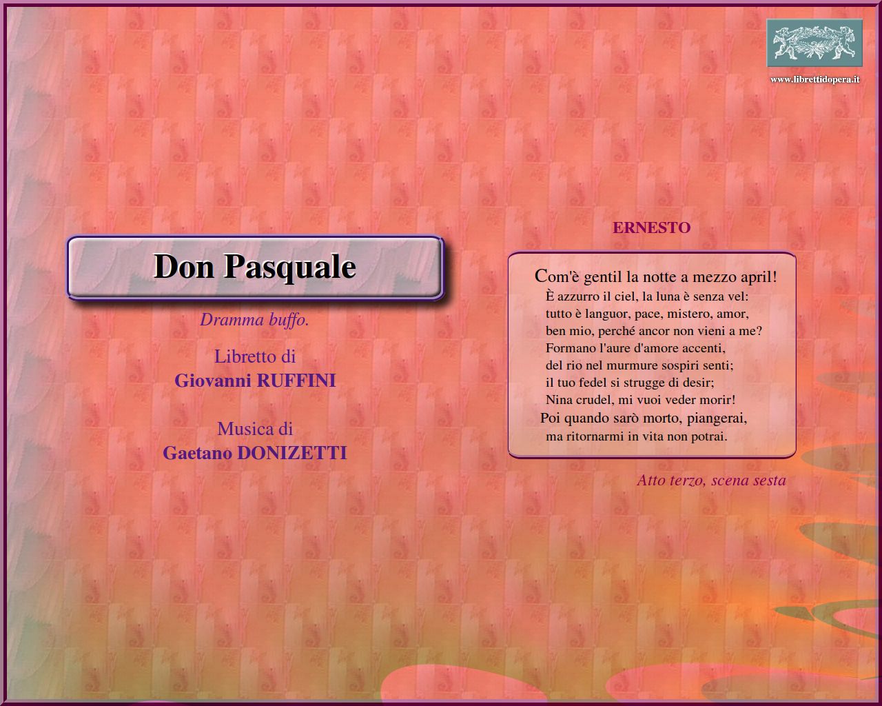 ⚫ La trama si rifà a un libretto di Angelo Anelli, musicato da Stefano Pavesi nel 1810 come Ser Marcantonio. Il librettista del Don Pasquale fu invece Giovanni Ruffini. Esule a Parigi perché mazziniano, Ruffini avrebbe poi scritto due romanzi di successo, Lorenzo Bernoni e Il dottor Antonio. Ma proprio perché letterato di alto lignaggio si rifiutò di far figurare il proprio nome nel libretto, sul frontespizio del quale appare l’indicazione ‘Dramma buffo in tre atti di M. A.’. Le sigle M. A. rispondono al nome e al cognome di Michele Accursi, un altro esule mazziniano amico sia di Donizetti sia di Ruffini. Come che sia, il libretto del Don Pasquale può non essere un saggio di alta letteratura, ma ritmo serrato e teatralità lo rendono, operisticamente parlando, eccellente.