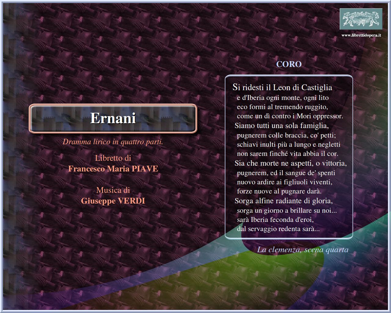 ⚫ Nei luoghi in cui Verdi attinge i risultati drammatici più convincenti […] i personaggi si sottraggono a [un] rigido schematismo e assumono una dimensione umana: nel terzetto finale, che segna il passaggio repentino dalla felicità alla catastrofe, l’espressività, la concisione, il fluire continuo dalle sezioni liriche alla recitazione drammatica, segnano l’aderenza ai mutamenti psicologici dei personaggi e alle passioni in gioco, rivelando nell’autore il sicuro istinto teatrale. Nuovo è anche l’intento drammaturgico di andare oltre l’accurata costruzione del singolo ‘numero’: in Ernani il controllo è esercitato sull’intero atto (esemplari sono l’unitarietà e la coerenza drammatica della terza parte). A ciò si unisce una particolare felicità creativa, che si traduce in una profusione di melodie accattivanti e facilmente cantabili, cui si deve l’immediata popolarità dell’opera. Una presa istintiva esercitano anche pagine virulente -come la canzone intonata dal coro dei banditi (“Evviva… beviam”) all’inizio dell’opera- nelle quali si dispiega un vigore primitivo ed elementare. Trascinante, nel suo effetto, è il coro “Si ridesti il leon di Castiglia”, nel quale Verdi tocca corde sensibili in anni risorgimentali: intorno al 1848 le parole del coro si prestarono a un’interpretazione patriottica e infiammarono d’entusiasmo più d’una platea italiana.