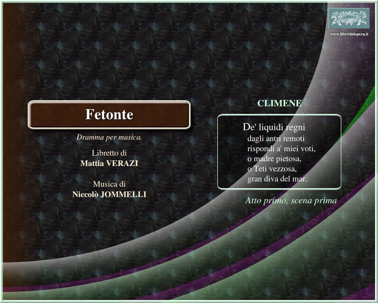 ⚫ L’opera che Jommelli scrisse per il nuovo teatro di Ludwigsburg, residenza estiva di Karl Eugen, principe elettore e duca di Württemberg, presenta tutti i caratteri dell’eccezionalità. Anzitutto per la nuova sala, attrezzata per i più moderni e spettacolari effetti scenografici […]. L’‘esperimento’ consistette nel coniugare i due modelli drammaturgici antitetici della tragédie lyrique francese e dell’opera seria italiana, combinando l’apparato spettacolare barocco della prima (cori, danze e meraviglie scenografiche) con il repertorio tematico classicistico della seconda (il soggetto mitologico ovidiano arricchito da divagazioni erotico/politiche), nonché le forme musicali di entrambe. Corresponsabile del progetto fu Mattia Verazi, già autore di testi importanti e originali per Traetta (Sofonisba, 1762) e per Jommelli stesso, decisamente orientati a forzare i limiti del canonico dramma per musica guardando con attenzione a Parigi.