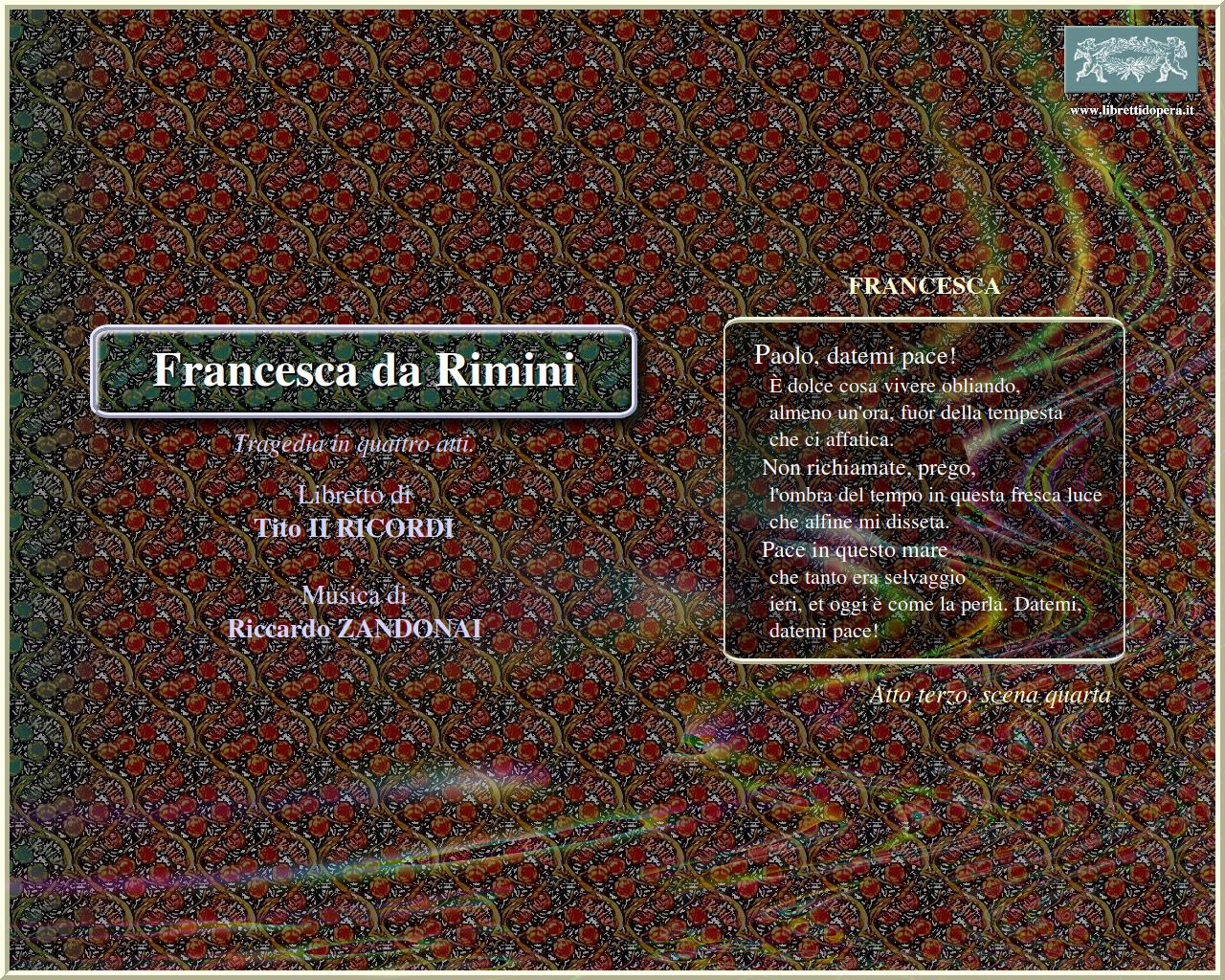 ⚫ La tragedia dannunziana, di notevole intensità drammatica (sia pure solitamente indulgente al dettaglio, poco prestantesi a esser musicato), molto deve per l’efficacia del libretto all’apporto di Tito Ricordi; che presta opportunità alla partitura più nota di Zandonai di svolgersi con pari, se non ancor più colorato andamento.