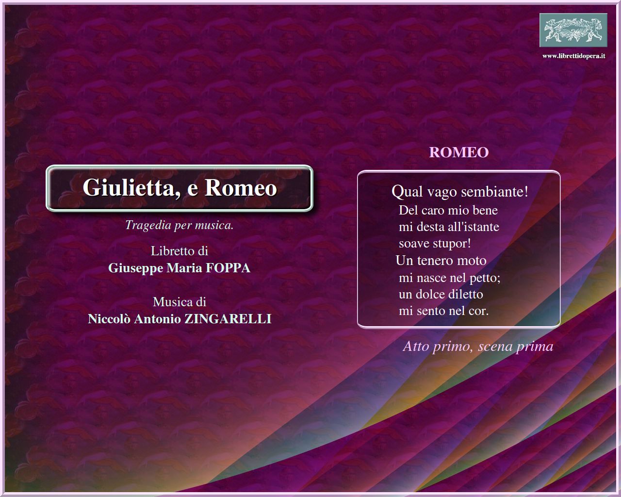 ⚫ Il Foppa si attiene alle linee essenziali della vicenda facendo coincidere la tragedia della lontananza con quella dell’infelicità. Egli rappresenta gli affetti secondo canoni ancora legati a un verseggiamento di stile affatto classico e legato, per molti aspetti, ancora a Metastasio. Ad esempio Romeo canta il suo innamoramento per Giulietta in un’aria di stile grazioso con parole di genere e circostanza: “Che vago sembiante, che luci vezzose”.