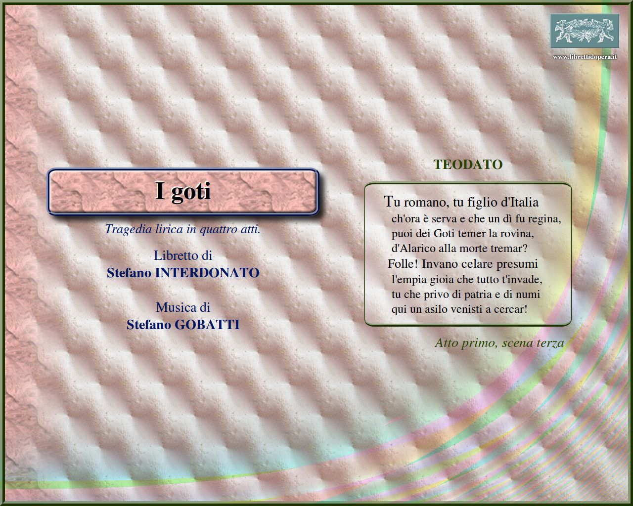 ⚫ I Goti -composta su un libretto che si inserisce agevolmente in quella maniera originatasi in seno alla Scapigliatura, ma già partecipe di un orientamento nuovo, vicino alla ‘giovane scuola’- propone una fosca vicenda intessuta di odi e di congiure, unico reale e paradossale punto di contatto con certa soggettistica d’oltralpe. In realtà, dal punto di vista costruttivo, l’opera non rinuncia affatto al formulario melodrammatico in uso ancora al tempo (un formulario verso il quale, in realtà, Verdi aveva mostrato di possedere margini di autonomia ancor più ampi); mentre, quanto all’impiego di uno stile che inclina spesso al declamato, la mancanza di melodia denuncia non tanto un deliberato disegno costruttivo, ma piuttosto una reale carenza di ispirazione.