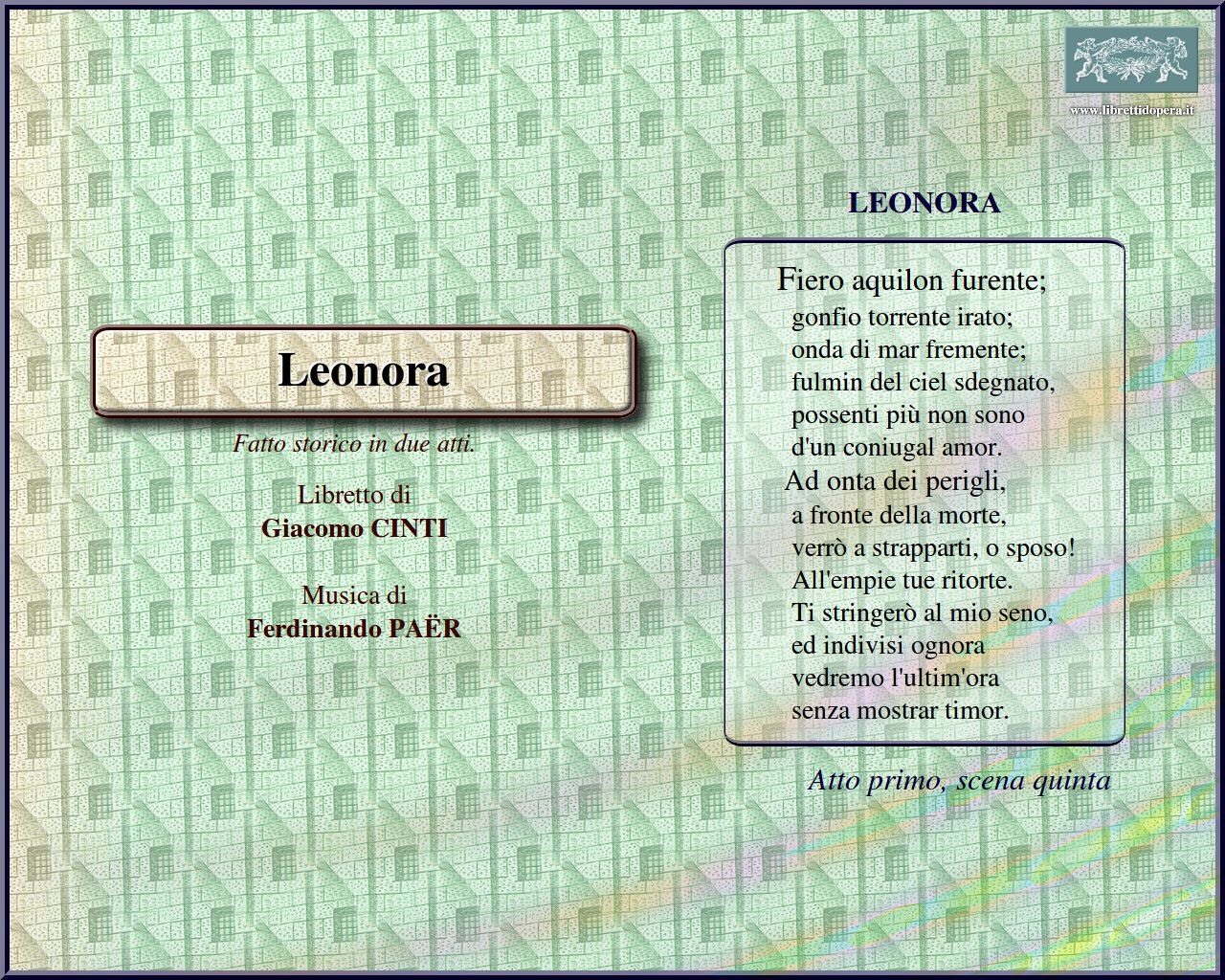 ⚫ La prima rappresentazione di Leonora, nella quale la moglie del compositore, il celebre soprano Francesca Riccardi, sosteneva il ruolo della protagonista, riscosse un grande successo. Le notevolissime qualità della partitura attirarono anche l’attenzione di Beethoven: in effetti, diversi e per molti aspetti sorprendenti sono i paralleli tra Leonora e Fidelio (distribuzione vocale, collocazione e tipologia compositiva di alcuni brani, scelte di orchestrazione e addirittura, nel terzetto fra Leonora, Florestano e Rocco, il medesimo ambiente tonale); non a caso una copia della partitura di Paër fu rinvenuta fra le carte di Beethoven dopo la sua morte. Non si deve però guardare a Leonora con curiosità soltanto per i suoi rapporti con Fidelio, ma soprattutto per la riuscita caratterizzazione dei personaggi, la freschezza dell’invenzione melodica, la ricchezza e la varietà di una scrittura orchestrale sempre finemente calibrata sulle diverse situazioni drammaturgiche