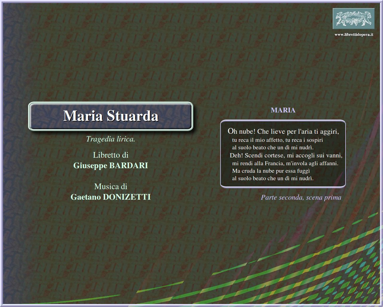 ⚫ Una sorte infelice accompagnò le prime vicende dell’opera. Nel 1834 Donizetti tornò a Napoli, dopo più di un anno di assenza, reduce da successi trionfali: […] nel mese di maggio il compositore iniziò a concentrarsi sulla tragedia schilleriana Maria Stuarda […]. Quando capì di non poter contare sulla collaborazione dell’inaffidabile Felice Romani, Donizetti si rivolse a Giuseppe Bardari, diciassettenne studente di legge, qui alla sua unica prova di librettista. Non fu possibile ultimare l’opera per il gala reale del 6 luglio; il ritardo accumulato fece sì che il compositore si accingesse al lavoro prima che il libretto venisse esaminato accuratamente e approvato dalla censura. A prove iniziate Bardari venne convocato da un censore, che gli impose alcuni cambiamenti sostanziali «subito passati al Maestro Donizetti per adattarvi la musica». Altri problemi erano sorti con l’epica zuffa accesasi tra le due prime donne durante la prima prova con l’orchestra. Le protagoniste dell’opera, Giuseppina Ronzi de Beignis e Anna Del Sere, erano venute alle mani durante la scena dello scontro fra Maria ed Elisabetta, dimentiche del decoro imposto loro dalla regalità dei personaggi. Aggiungiamo che la divina Ronzi andava in giro dicendo: «Donizetti protegge quella p… della Delsere», al che il compositore non perse l’occasione di precisare in che conto tenesse sia i personaggi storici protagonisti della sua opera, sia le interpreti che li creavano; «io non proteggo alcuna di voi, ma p… erano quelle due, e due p… siete voi». La divina, racconta il compositore, «si persuase, o s’avvilì o s’acquietò… non più parlò, si seguitò, ella cantò, poi non s’andò…». Infatti non si andò in scena: dopo la prova generale, i censori (fra i quali Basilio Puoti, maestro di Francesco De Sanctis e di Luigi Settembrini), forse per l’intervento diretto del re, chiesero il ritiro del libretto.