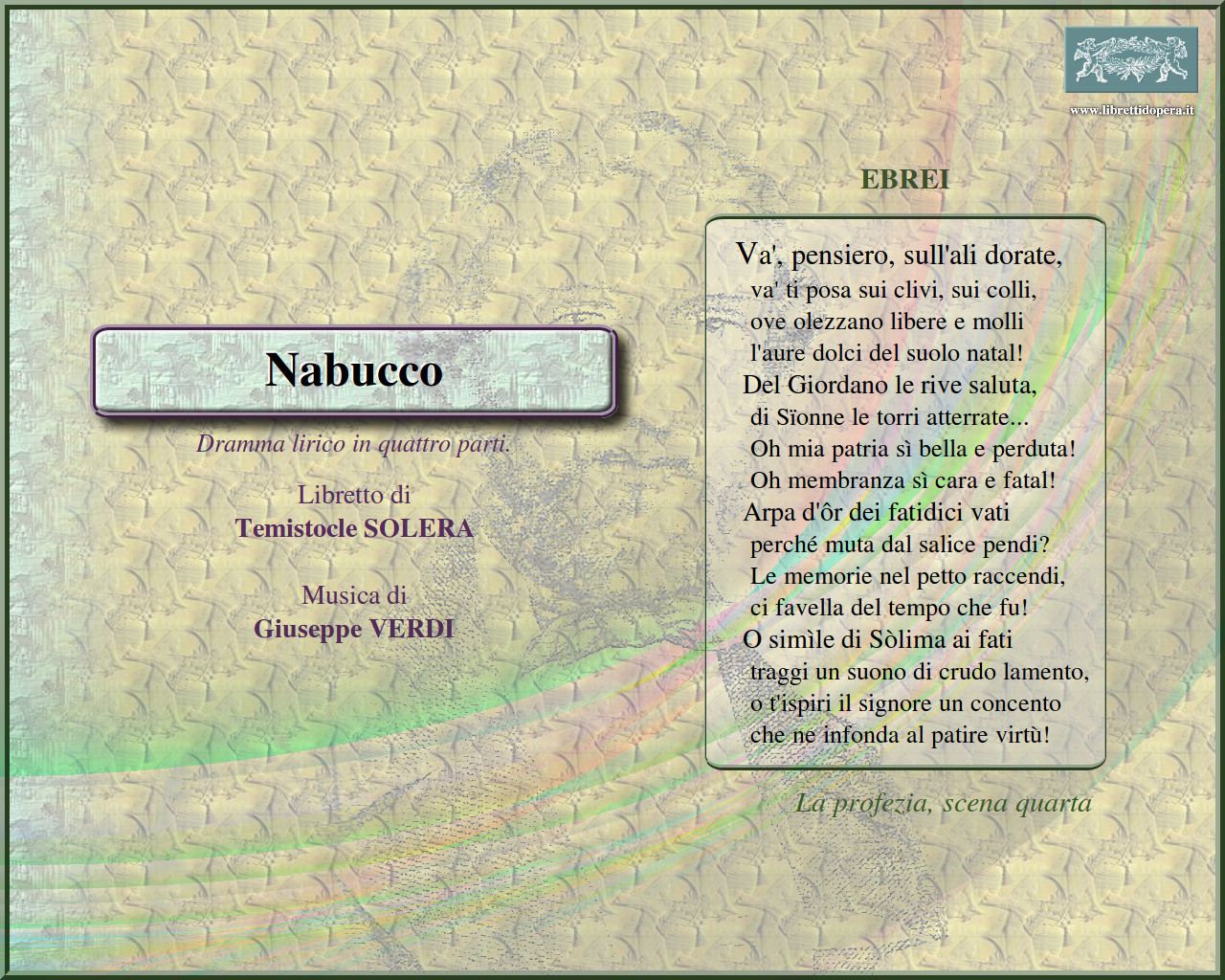 ⚫ La fortuna di Nabucco è strettamente legata al successo di una delle pagine più celebri, il coro “Va pensiero” che, erroneamente, certa critica sostiene essere stato bissato alla prima esecuzione, laddove fu invece il coro “Immenso Jeovha” a essere replicato. In realtà “Va pensiero” costituisce il fulcro ideale di un’opera che, se contempla naturalmente passioni individuali (l’amore tra Fenena e Ismaele, il conflitto tra Abigaille e Nabucco, l’amore paterno di Nabucco per Fenena), è fortemente connotata come dramma corale che si articola attraverso una serie di ampi pannelli. Non è dunque un caso che già dalla sinfonia, in cui, come di consueto, si concentra l’essenza drammatica dell’intera partitura, il tema presentato come principale sia quello della fermezza degli Ebrei di fronte alla persecuzione, seguito dal tema della maledizione di Ismaele.