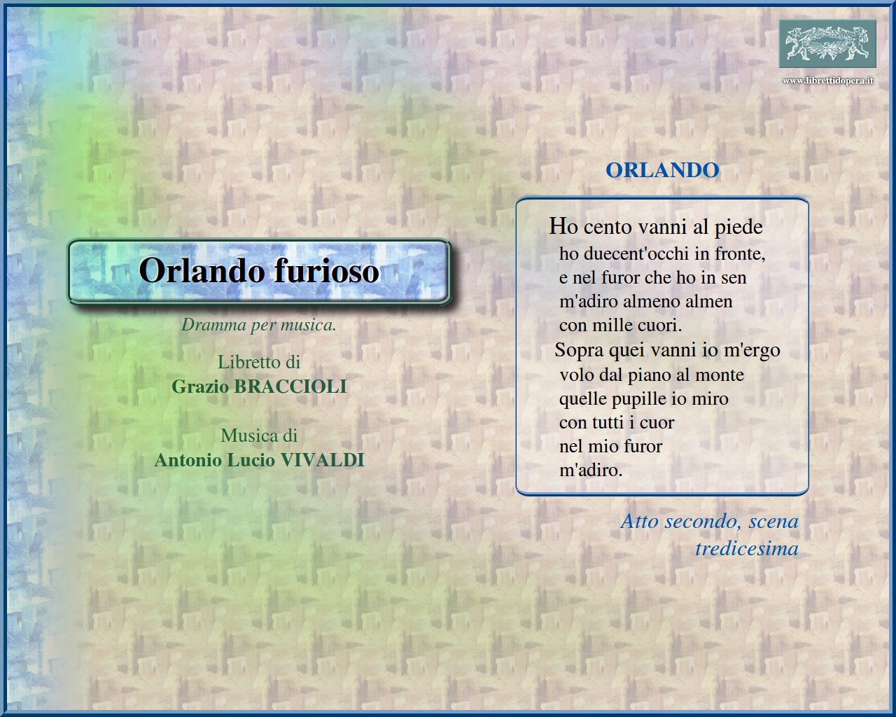 ⚫ L’Orlando rappresentato nell’autunno 1727 al Teatro Sant’Angelo di Venezia non fu la prima opera di Vivaldi ispirata al poema ariostesco: nel 1713, quando il compositore era probabilmente impresario al Sant’Angelo […] era stato allestito con successo l’Orlando furioso di Giovanni Alberto Ristori su libretto di Braccioli, cui forse aveva contribuito lo stesso Vivaldi. Questi aveva poi chiesto al poeta ferrarese di scrivere un altro testo sul medesimo argomento, e l’anno successivo aveva portato in scena Orlando finto pazzo: l’opera era stata un fiasco e per salvare la stagione il musicista aveva riproposto l’opera di Ristori, riscrivendo parte della musica per il nuovo cast. Anni dopo Vivaldi decise di riprendere il libretto della versione del 1714 per una nuova opera; ma Braccioli era tornato a Ferrara, e il poeta che rielaborò il testo rimane sconosciuto. Secondo una prassi allora consueta, dovuta anche al tempo limitato a disposizione, Vivaldi riprese arie dalle opere precedenti, in un intreccio di prestiti che ancor oggi la critica non ha individuato in modo univoco; il fatto che molte arie dell’Orlando ritornino a loro volta ne L’Atenaide (Firenze, carnevale 1729) è una testimonianza indiretta del successo riscosso dall’opera veneziana. […] Nel 1978, per il tricentenario della nascita di Vivaldi, Claudio Scimone ha presentato l’opera con il titolo Orlando furioso al Teatro Filarmonico di Verona […].