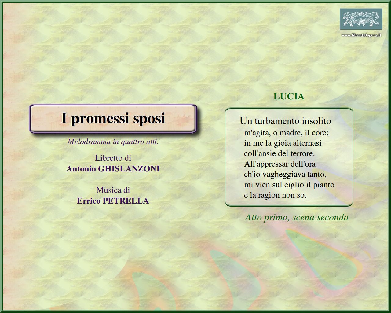 ⚫ Nel suo libretto Antonio Ghislanzoni ricorse a modelli operistici codificati, ora dichiaratamente buffi (per personaggi come Don Abbondio e Perpetua), ora più lirici e sentimentali (Renzo e Lucia); in ogni caso, lontani da quella «complessa meditazione morale e religiosa, civile e letteraria» (Carli Ballola) che era stata alla radice del romanzo. Eppure Petrella riuscì a rinnovare il proprio linguaggio, ottenendo in alcuni casi anche risultati originali, sostanzialmente immuni da quell’epigonismo di maniera che connota molta produzione minore del tempo.