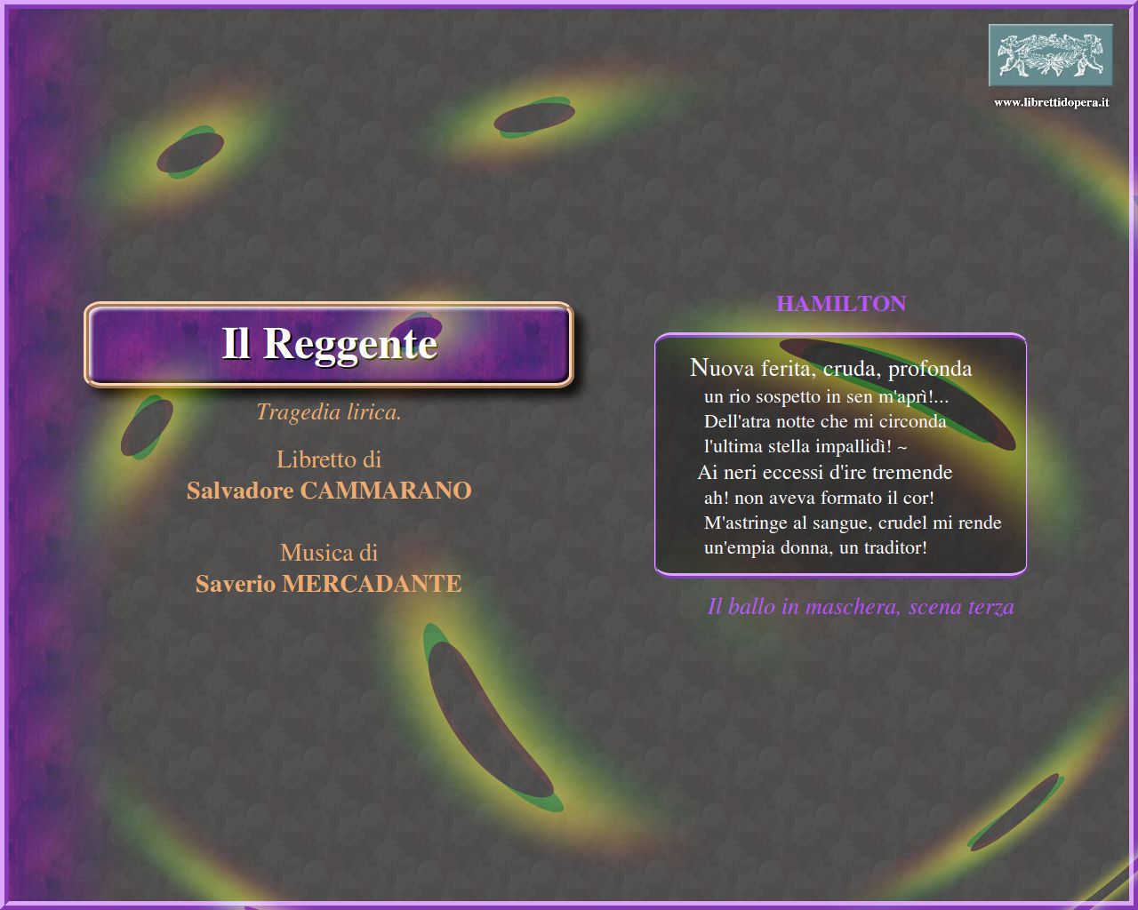 ⚫ […] l’opera di Mercadante che, composta quindici anni prima del capolavoro verdiano, denuncia la sua piena appartenenza alla tradizione teatrale del tempo, presentando Oscar come un tipico mezzosoprano en travesti di primo Ottocento e non rinunciando alla consuetudine di attribuire a ogni atto un titolo diverso (‘Il sortilegio’; ‘La dama velata’; ‘Il ballo in maschera’), come avveniva nel coevo romanzo d’appendice.