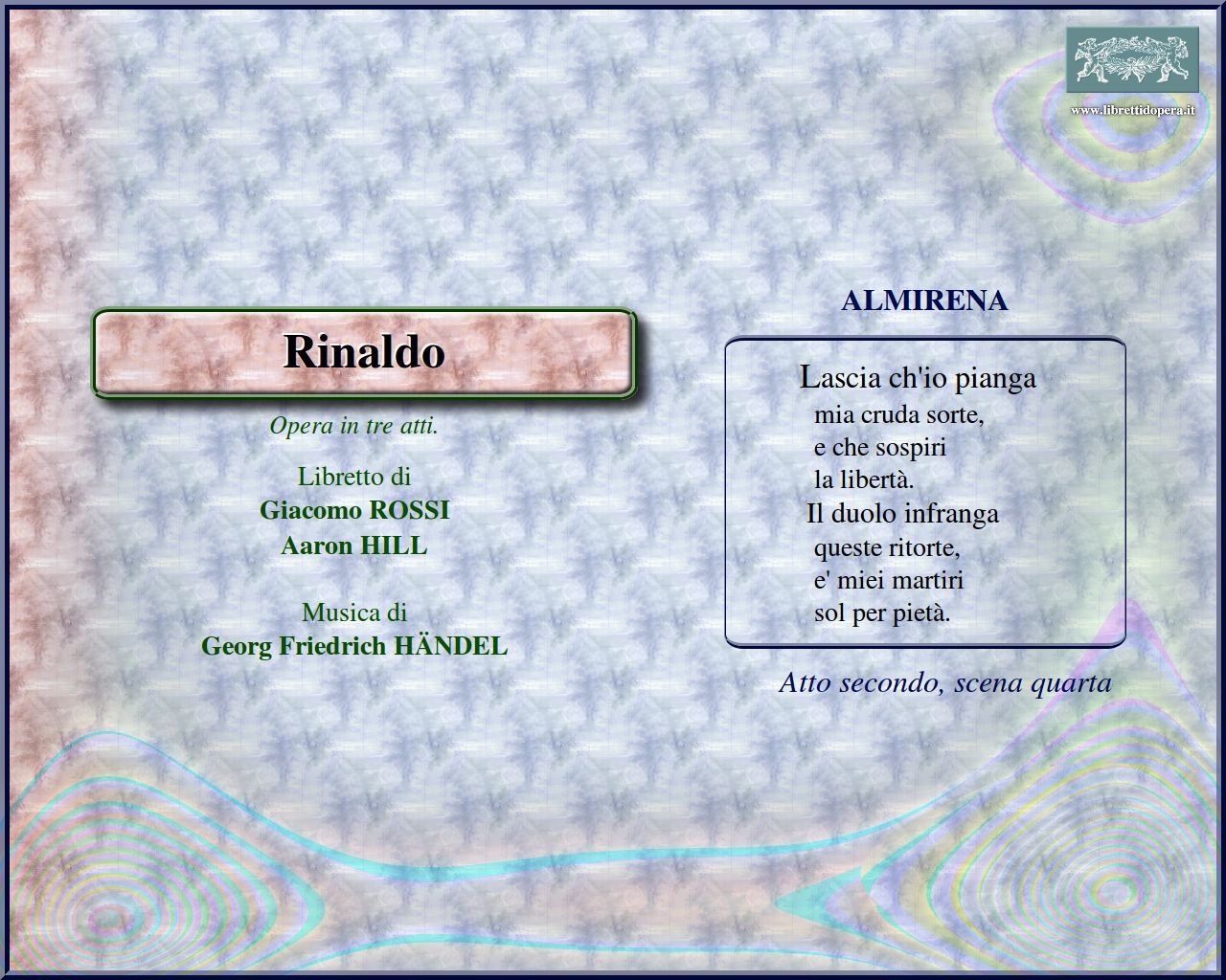 ⚫ Per quanto riguarda la partitura, Händel utilizzò in misura larghissima quanto aveva scritto nel suo ancora recente viaggio di formazione italiano (1707-’10), tanto più che nessuno dei brani riutilizzati nel Rinaldo sarebbe risultato noto al pubblico inglese nella sua veste originaria. I prestiti avvennero, ad esempio, dalla serenata Aci, Galatea e Polifemo, scritta a Napoli nel 1708 (l’aria di Argante «Sibilar gli angui d’Aletto»); dall’oratorio Il trionfo del tempo e del disinganno del 1707 (l’aria di Almirena «Lascia ch’io pianga», seppure con modifiche e testo diverso, e il coro finale dell’opera «Vinto è sol dalla virtù»); dall’opera Agrippina, rappresentata con successo a Venezia nel carnevale del 1710 (il duetto Armida-Rinaldo «Basta che sol»); da una cantata del 1707 (lo splendido duetto Almirena-Rinaldo «Scherzano sul tuo volto») e da un’altra cantata del 1708 (il tempo lento dell’ouverture). Oltre agli imprestiti integrali appena segnalati, numerosissimi sono gli spunti tematici che l’opera deriva da lavori precedenti e rielabora in senso nuovo, mentre Händel non si scompone nemmeno di fronte all’utilizzo di testi tratti da composizioni altrui. Nonostante questa sua natura di pasticcio, ossia di opera formata da pezzi di origine disparata, Rinaldo fu – ed è ancora – opera di straordinario successo, nato già dall’idea di Hill come un meccanismo teatrale di sicura efficacia sulle scene inglesi, sia per l’abbondanza di trovate spettacolari (draghi, sirene e quant’altro), sia per il moralistico incitamento a una virtù perseverante, che è in grado di sconfiggere ogni tentazione, per quanto temibile e insidiosa.