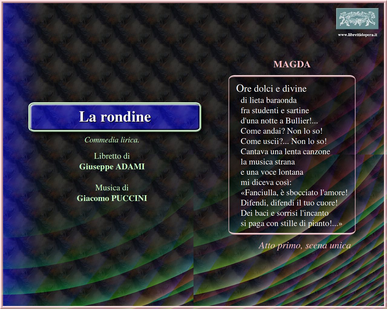 ⚫ Pubblicista di facile vena l'Adami, dal teatro milanese di Felicita Colombo (ma anche veneziano e in lingua) a soggetti e regie per il cinematografo, riflette anche nell'appassionato accostamento al melodramma (fu amico e biografo di Puccini) l'occhio attratto da varie esperienze. La disposizione conciliante e la cantabilità facile che lo porteranno a improvvisare operette melodrammatiche […] sulla voga viennese negli anni che precedono […] o seguono la prima guerra mondiale, l'assistono nella complessa genesi de La rondine (1917) per Puccini: sostanza da operetta d'un gusto liberty dal simbolismo epidermico, adattata a piccola opera dalle strutture musicali più agili e audaci. Cascami di letteratura post-romantica, con grisettes, studenti, pittori e fioraie, e casa di vacanza sulla Costa Azzurra ormai nelle abitudini della bella mondana col suo studentino, si riversano sulle scene, e prendon vita nell'evocazione canora d'un mondo passato, suggestiva nelle ripetizioni […] Un simbolismo troppo facile guida la vicenda, ma il librettista vi imita anche il richiamo delle «piccole cose» pucciniane, non più reali, ma caricate di sentimento in questo mondo fittizio, e gravate di effettismo patetico: […]