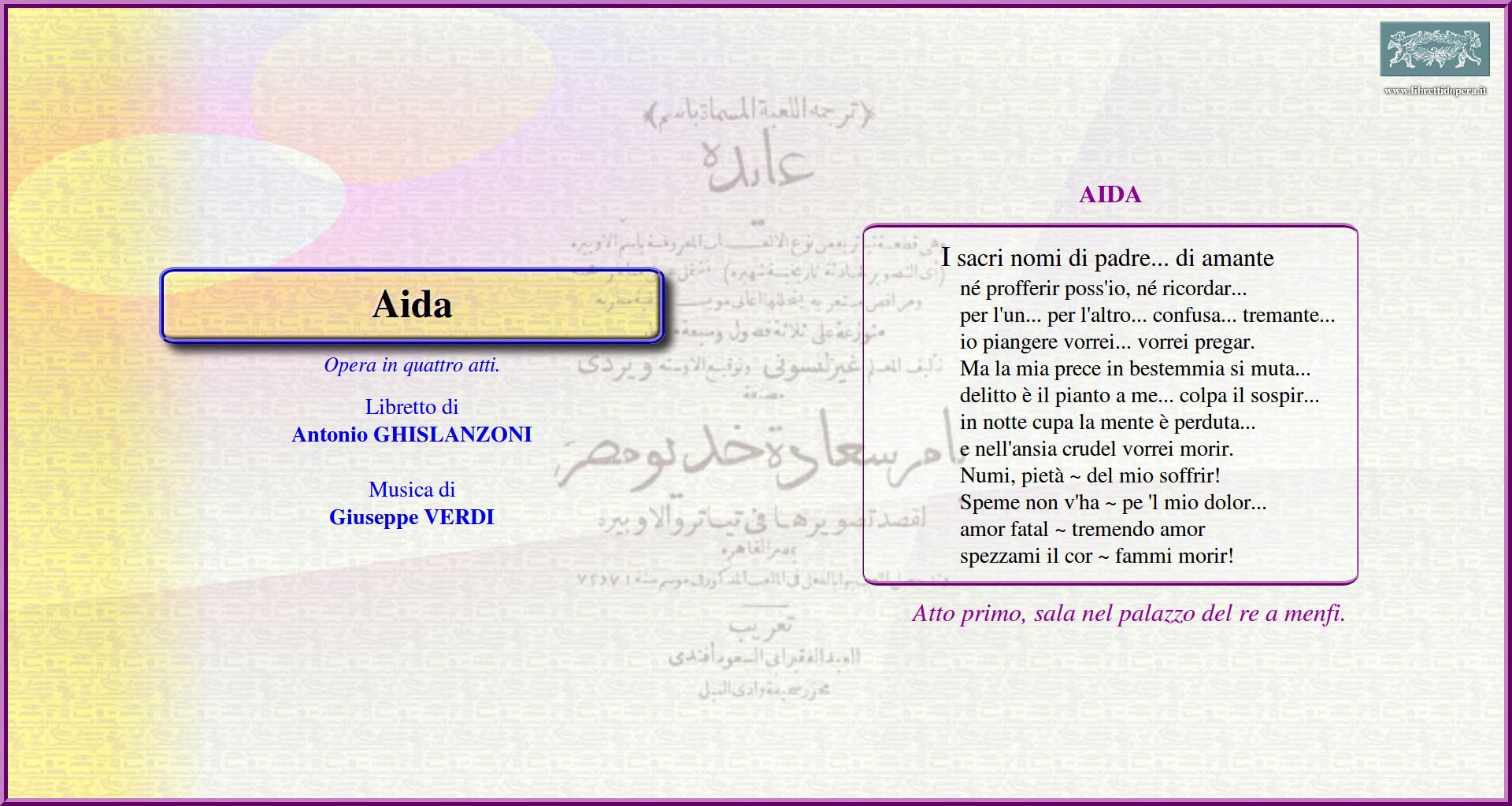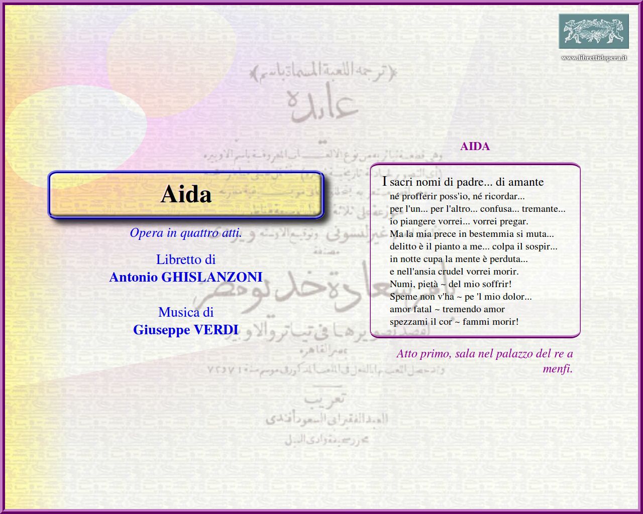 Prima pagina con ritratto di Verdi I sacri nomi di padre... di amante Celeste Aida, forma divina Questa assisa ch'io vesto vi dica Gloria all'Egitto e ad Iside O cieli azzurri... o dolci aure native Morir! sì pura e bella!