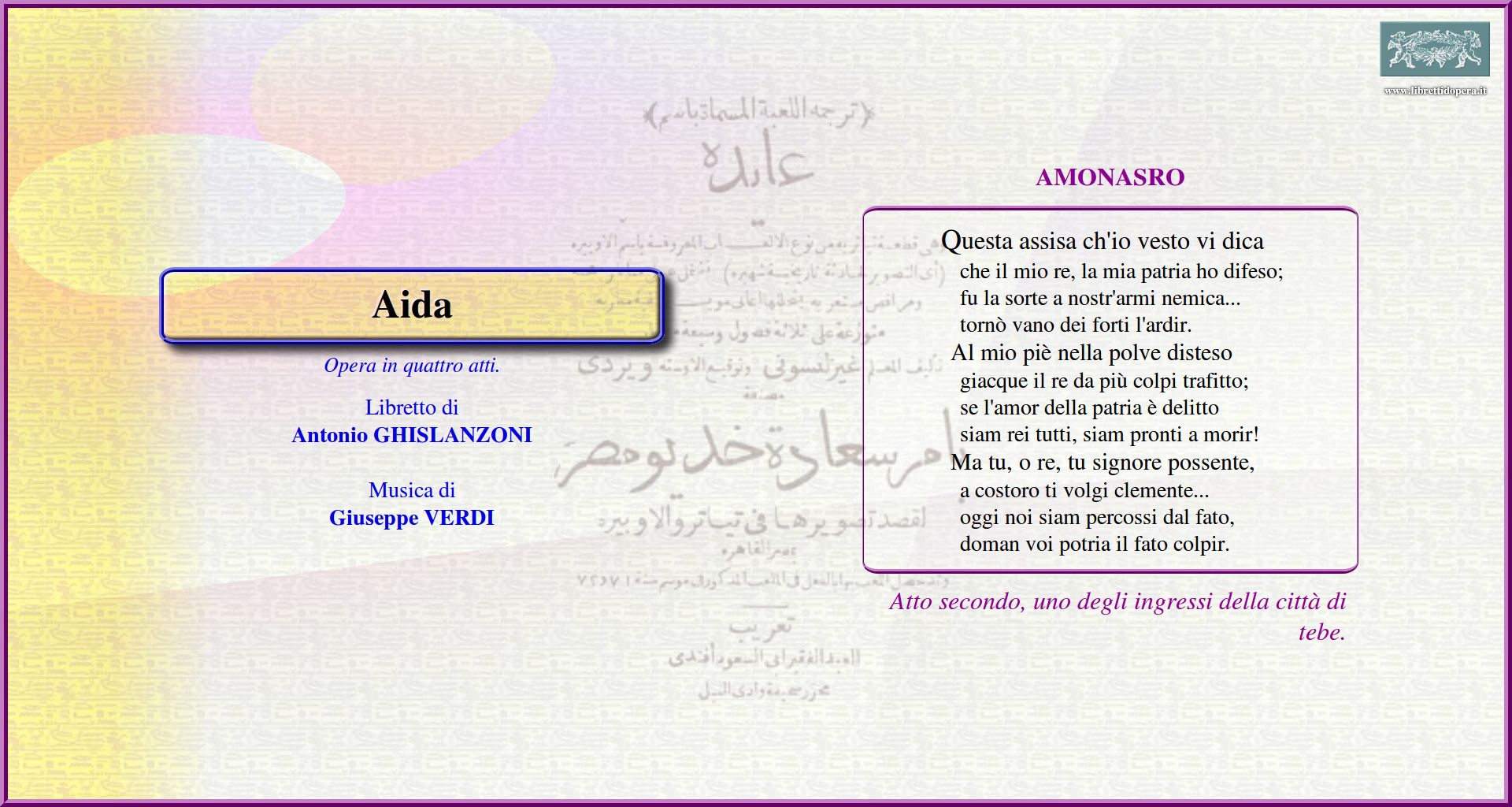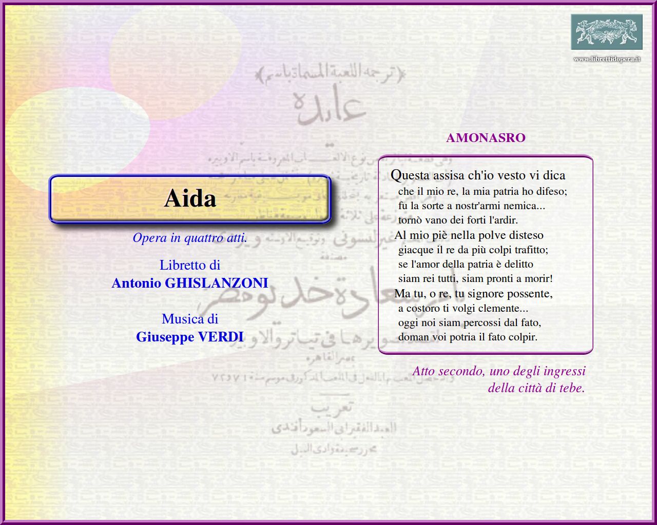 Prima pagina con ritratto di Verdi I sacri nomi di padre... di amante Celeste Aida, forma divina Questa assisa ch'io vesto vi dica Gloria all'Egitto e ad Iside O cieli azzurri... o dolci aure native Morir! sì pura e bella!