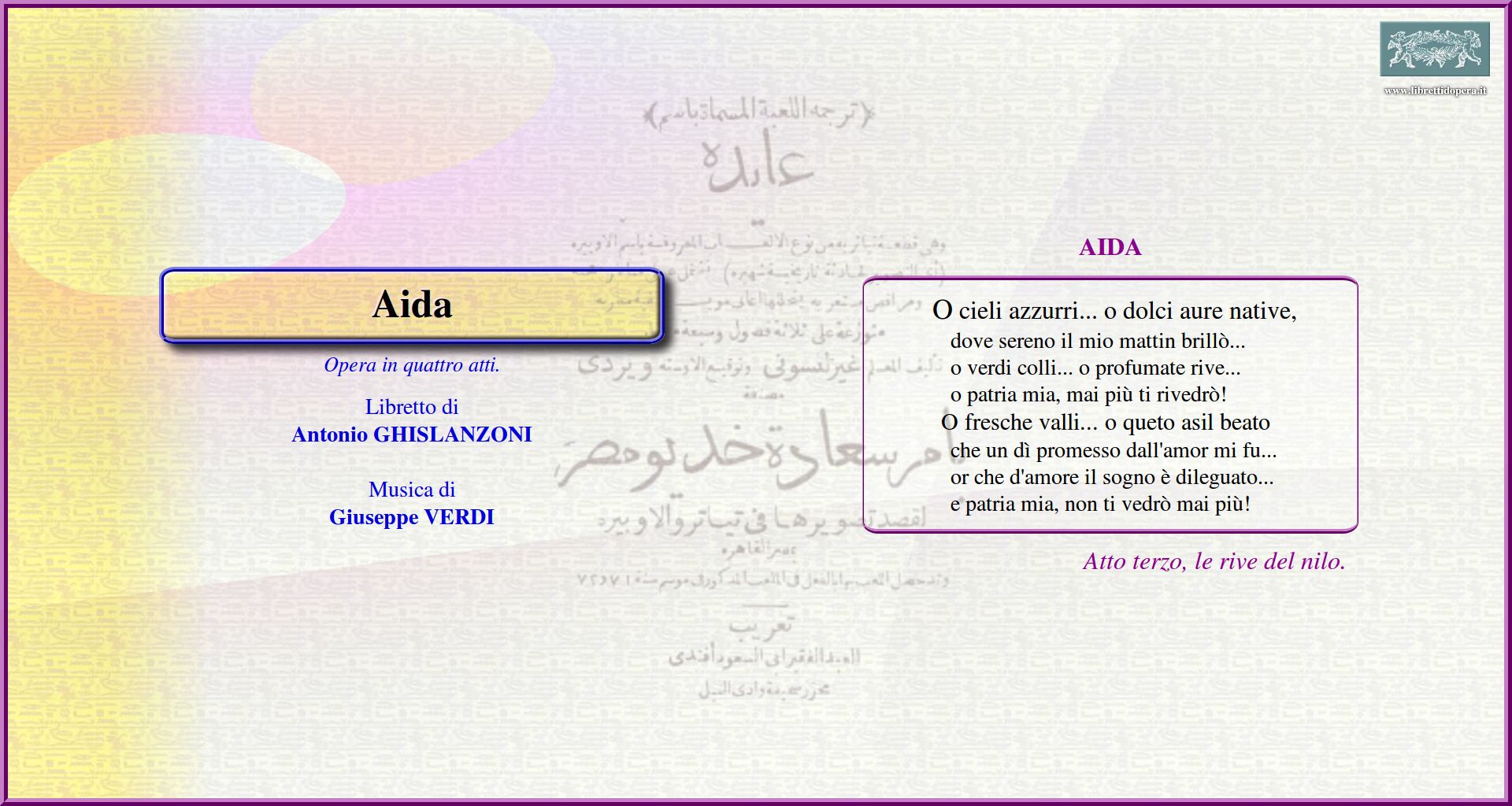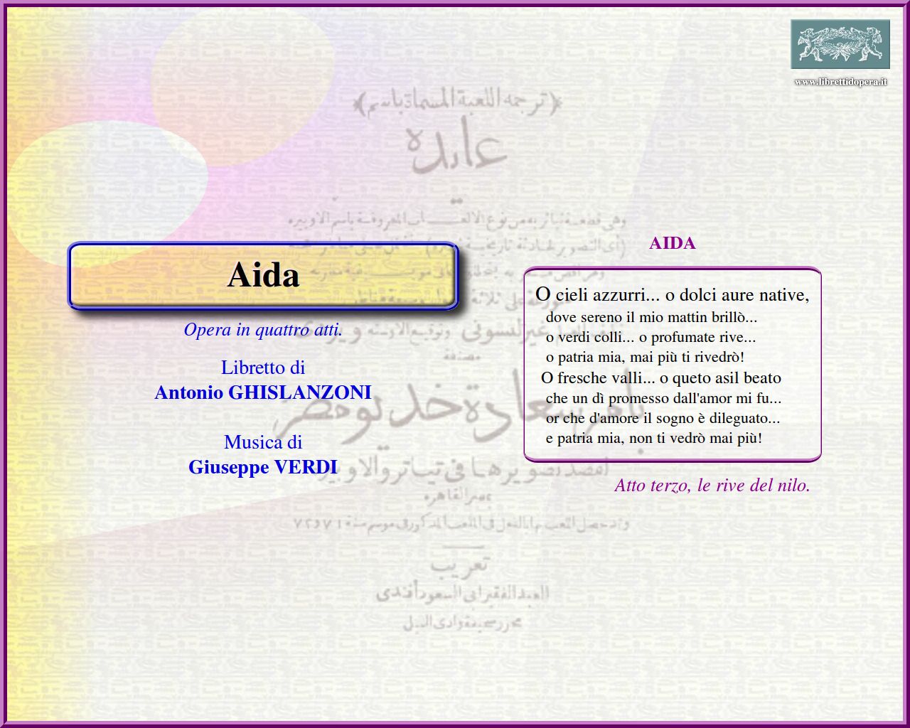 Prima pagina con ritratto di Verdi I sacri nomi di padre... di amante Celeste Aida, forma divina Questa assisa ch'io vesto vi dica Gloria all'Egitto e ad Iside O cieli azzurri... o dolci aure native Morir! sì pura e bella!