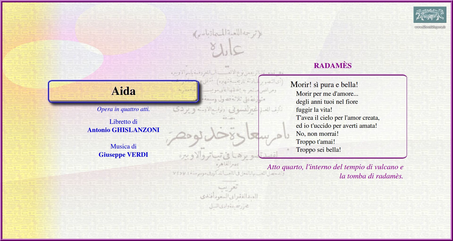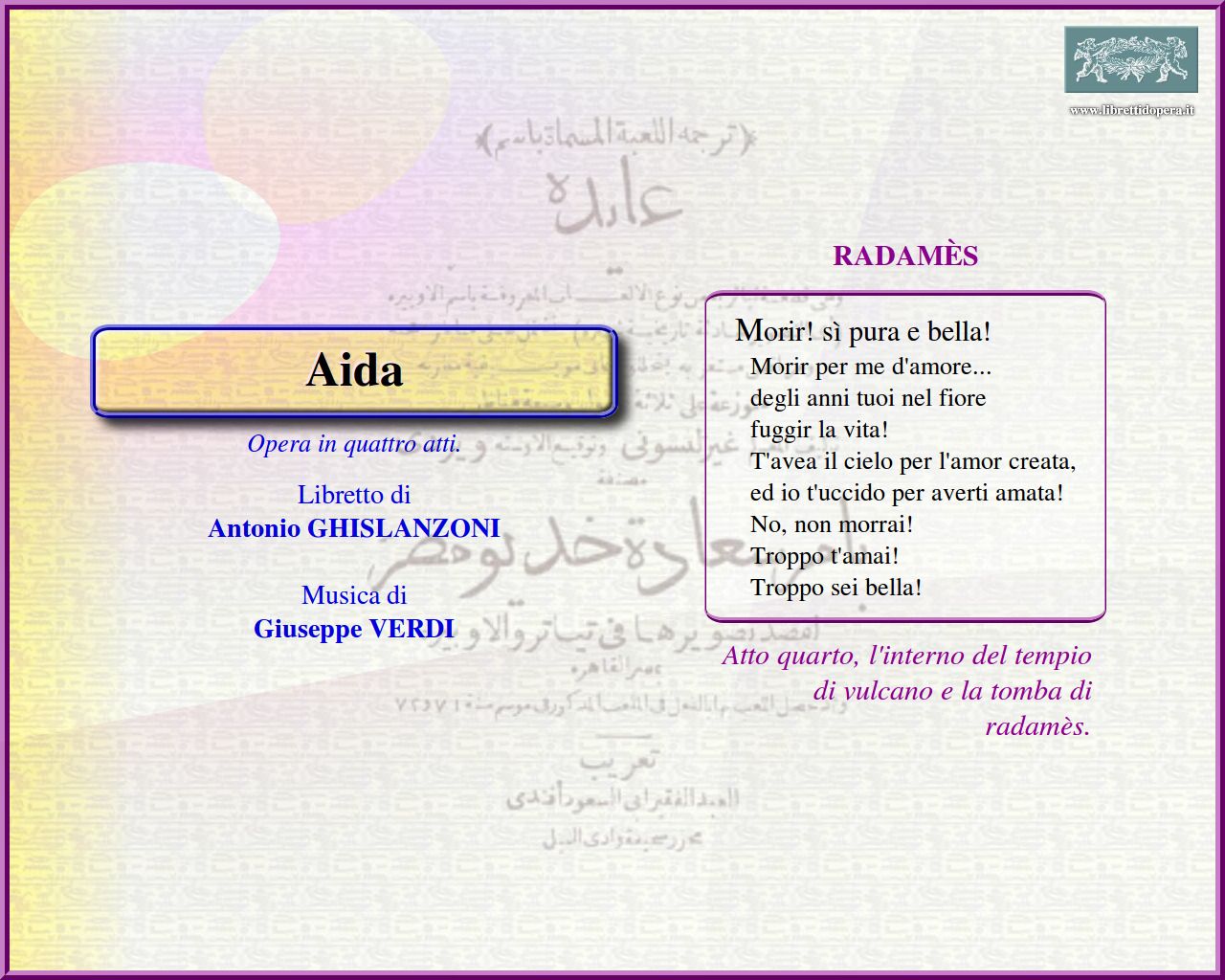 Prima pagina con ritratto di Verdi I sacri nomi di padre... di amante Celeste Aida, forma divina Questa assisa ch'io vesto vi dica Gloria all'Egitto e ad Iside O cieli azzurri... o dolci aure native Morir! sì pura e bella!