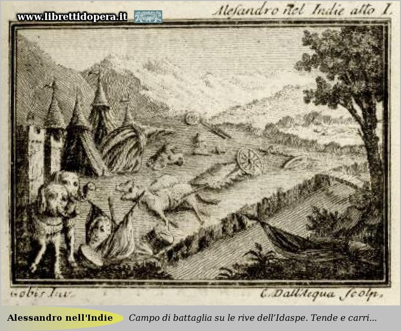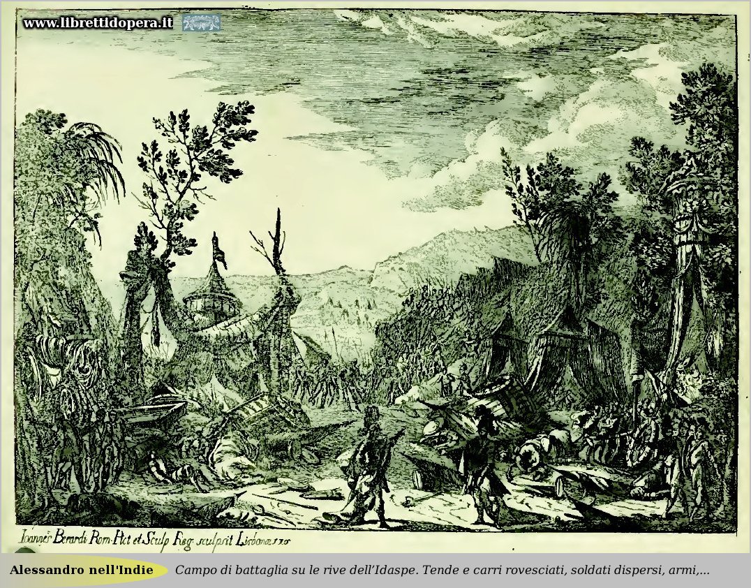 Scena prima Campo di battaglia su le rive dell'Idaspe. Tende e carri rovesciati, soldati dispersi, armi, insegne ed altri avanzi dell'esercito di Poro disfatto da Alessandro.