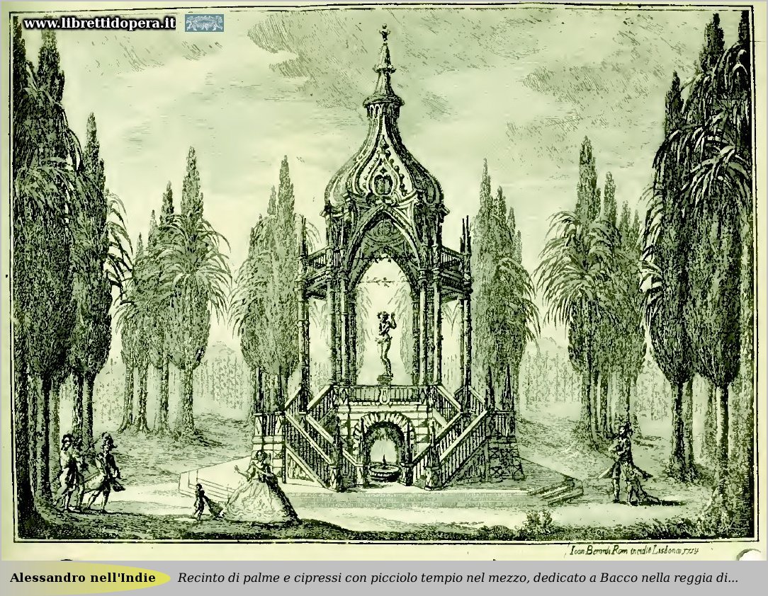 Scena sesta Recinto di palme e cipressi con picciolo tempio nel mezzo, dedicato a Bacco nella reggia di Cleofide.
