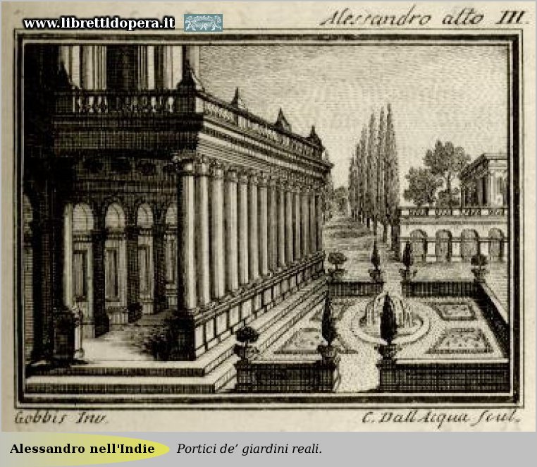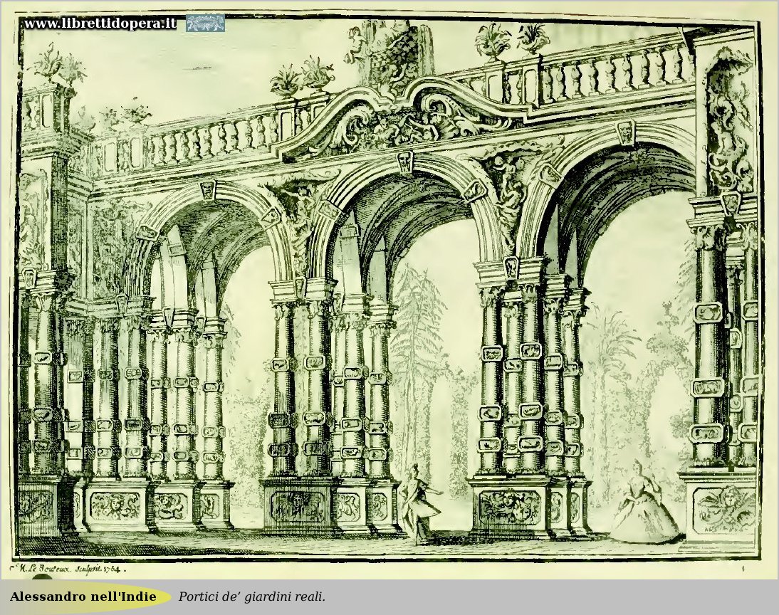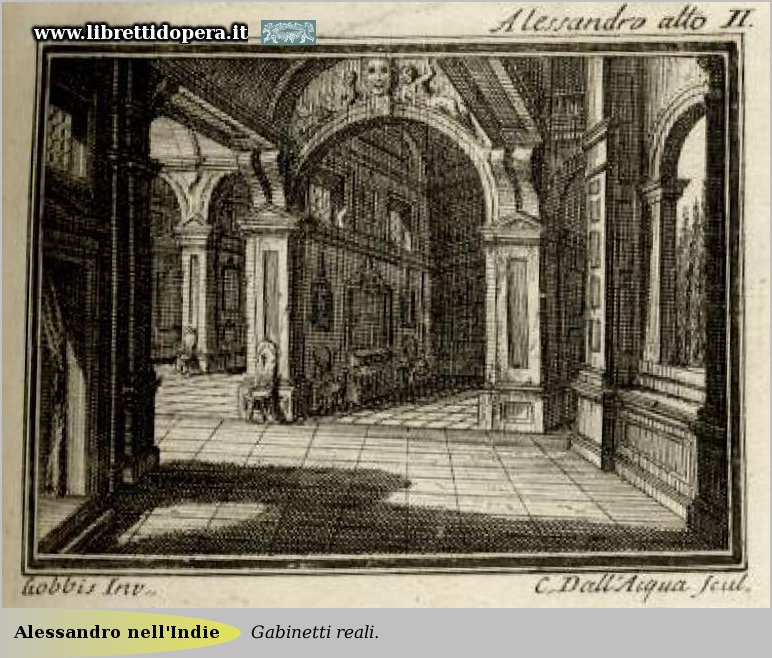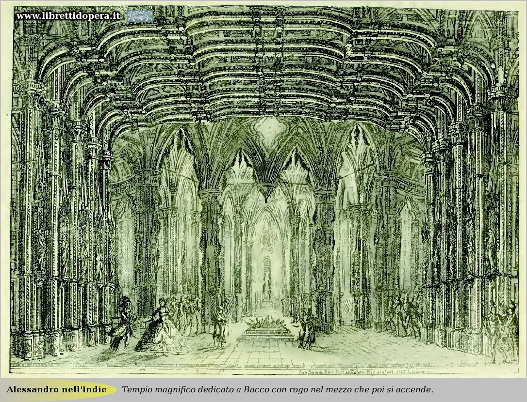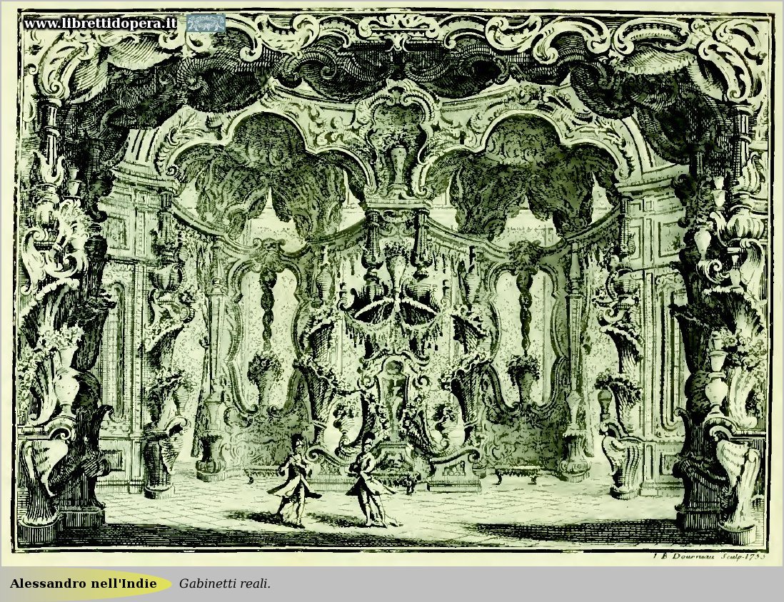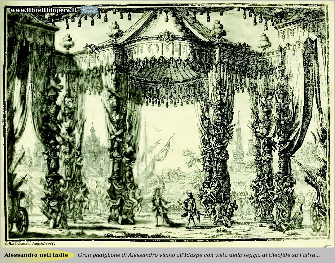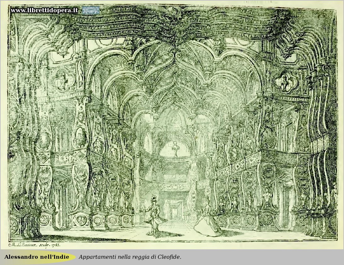 Scena tredicesima Si vedono venire diverse barche per il fiume, dalle quali scendono molti indiani del Séguito di Cleofide portando diversi doni, e dalla principale sbarca la suddetta Cleofide incontrata da Alessandro.