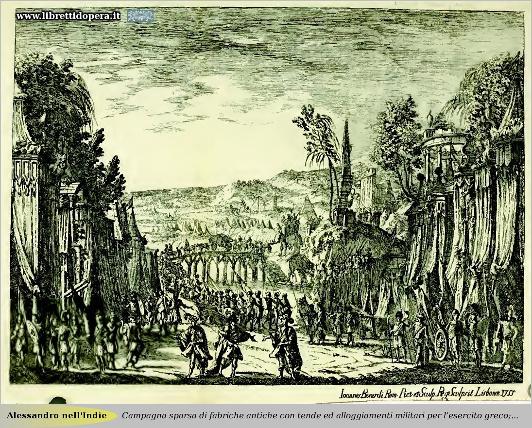 Campagna sparsa di fabriche antiche con tende ed alloggiamenti militari per l’esercito greco; ponte su l’Idaspe; campo numeroso di Alessandro disposto in ordinanza di là dal fiume, con elefanti, torri, carri coperti e macchine da guerra.