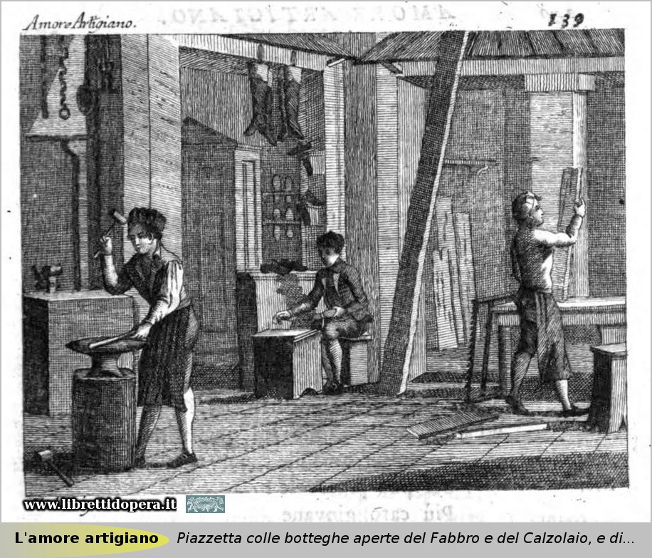 Scena diciassettesima Piazzetta come nelle scene antecedenti, colle botteghe aperte del Fabbro e del Calzolaio, e di più in mezzo la bottega aperta del Legnaiuolo col banco fuori, e varie tavole ed instrumenti di cotal arte. Fuori della bottega del Fabbro una picciola incudine, e fuori di quella del Calzolaio una pietra, su cui tali artisti sogliono battere il cuoio; di qua e di là le case come prima.