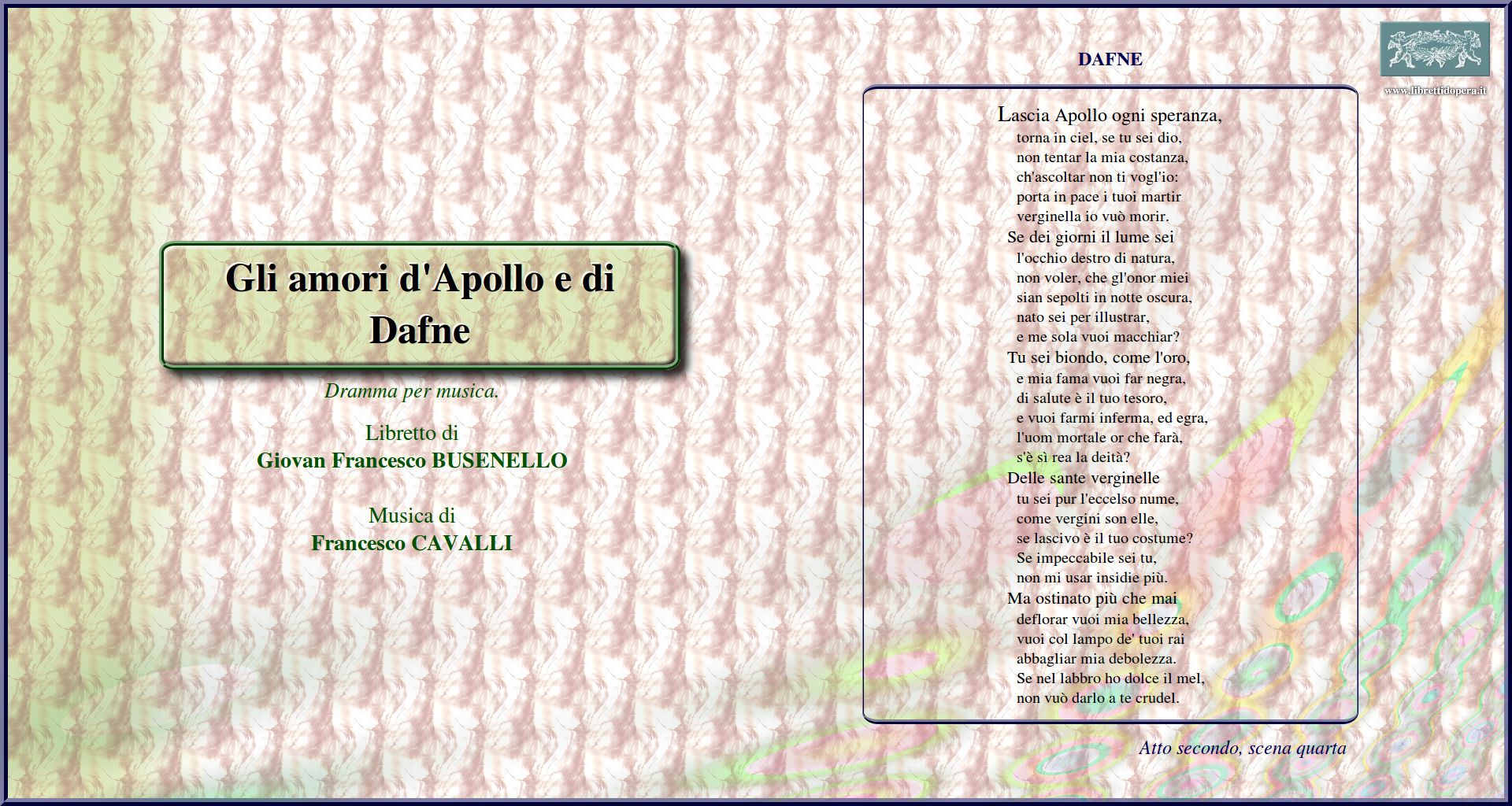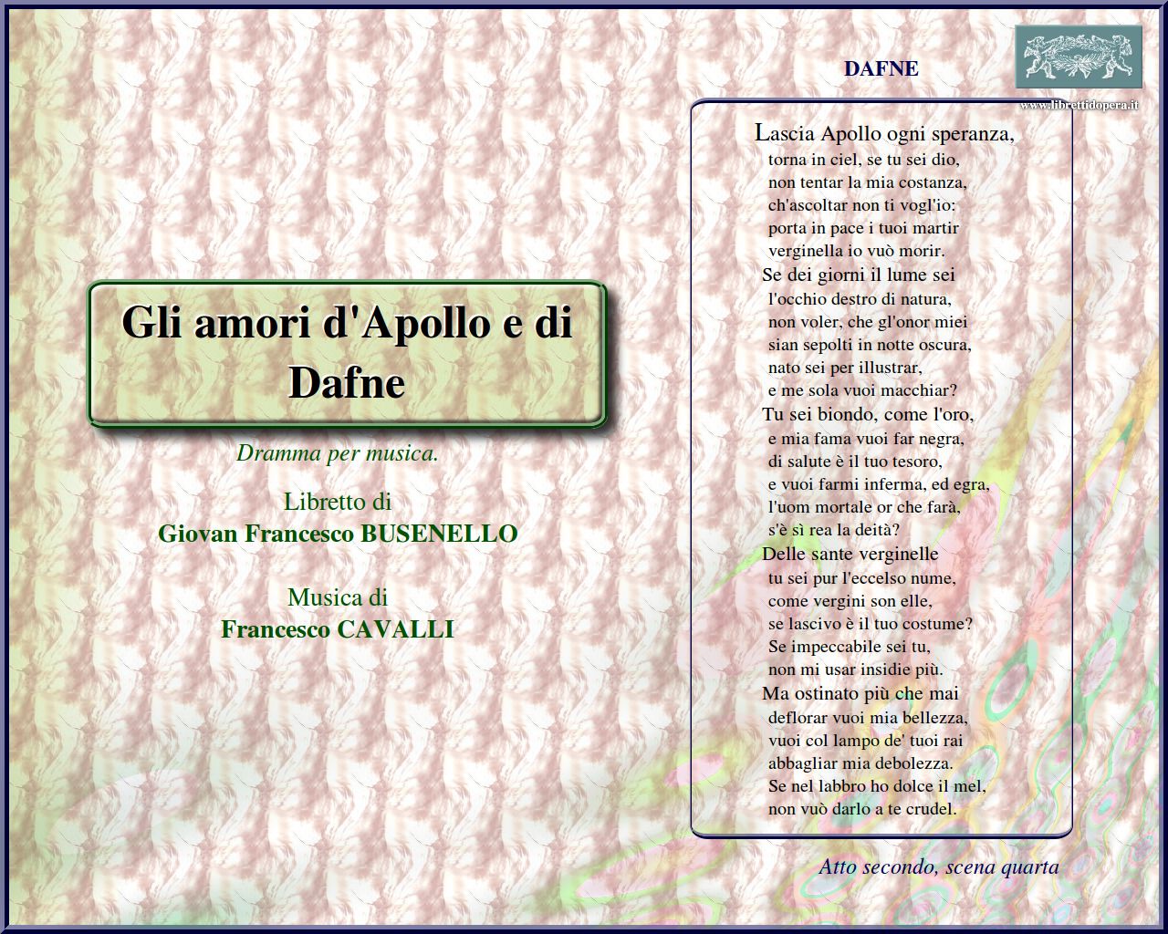 Uscite in varie torme Quel bel fior di giovinezza Lascia Apollo ogni speranza Ohimè, che miro? Ohimè dunque, in alloro