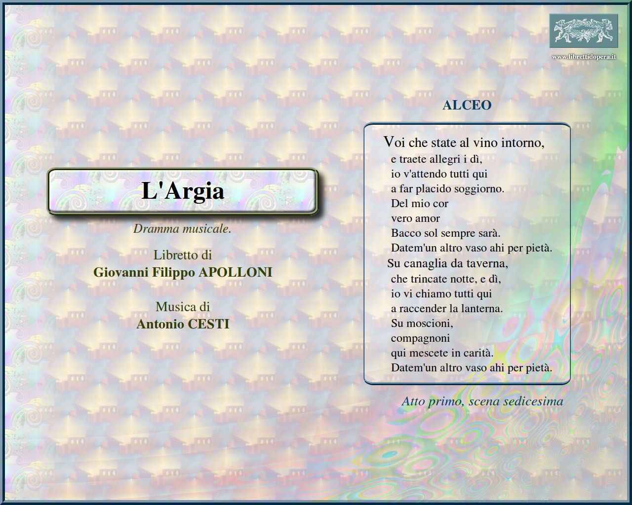 Ecco l'alba, che ridente Nascer grande, ahimè, che giova Voi che state al vino intorno Affanni, tiranni Questa Dema ha gran faccende, Incaute femmine Alle gioie, ai diletti, ai vezzi, ai baci