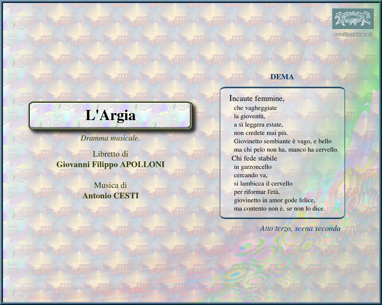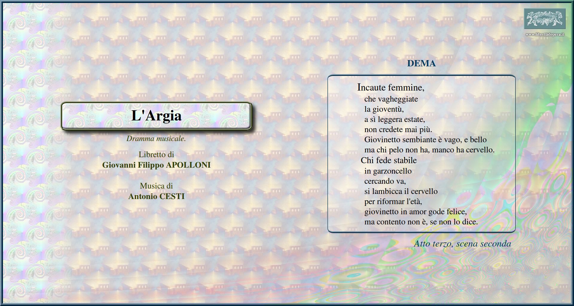 Ecco l'alba, che ridente Nascer grande, ahimè, che giova Voi che state al vino intorno Affanni, tiranni Questa Dema ha gran faccende, Incaute femmine Alle gioie, ai diletti, ai vezzi, ai baci
