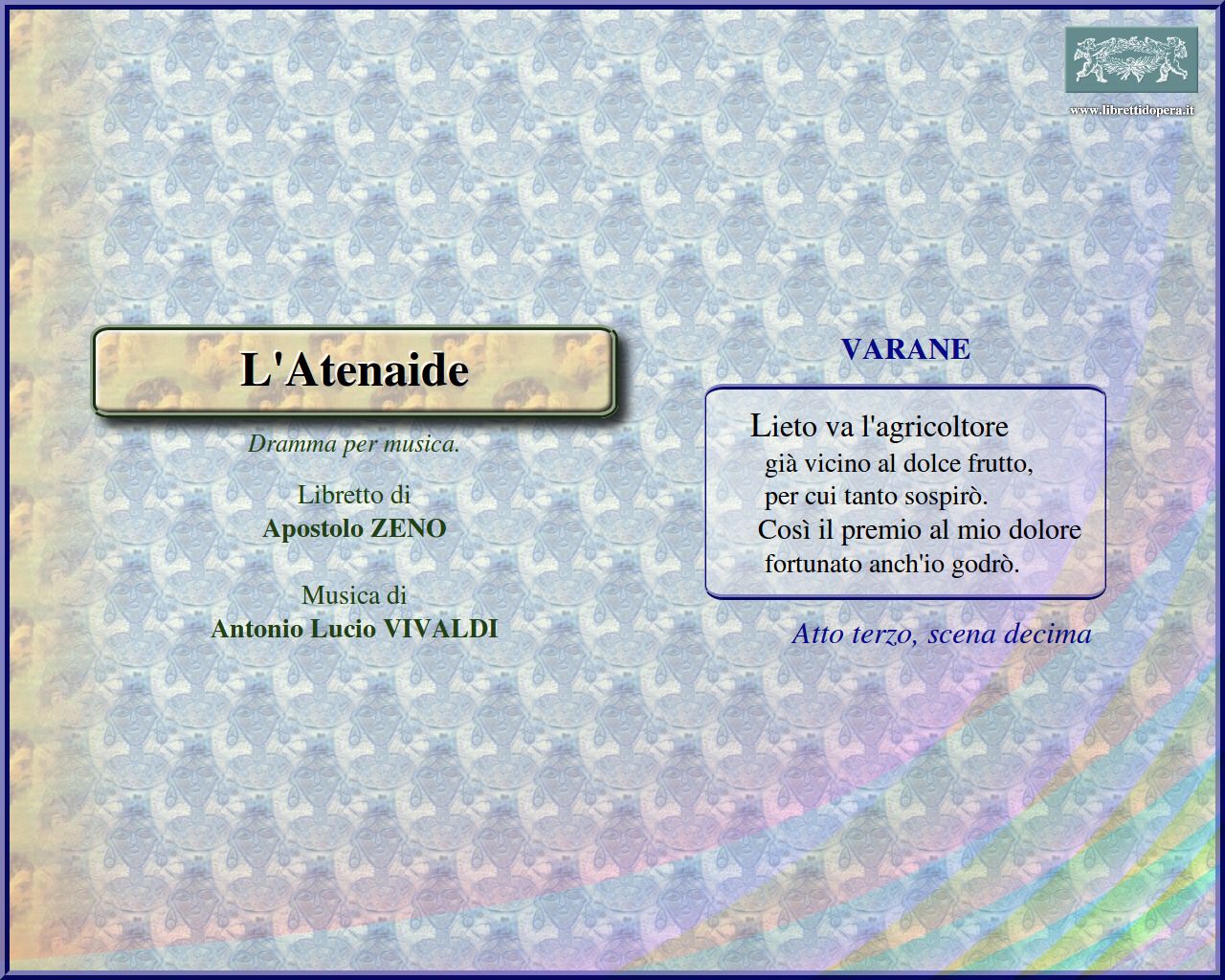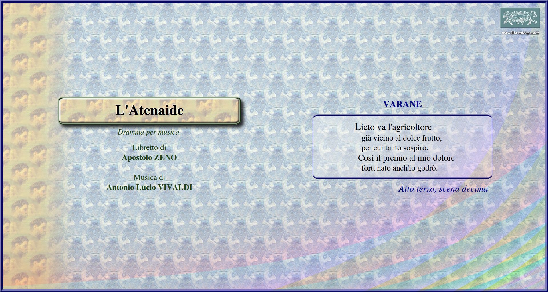 Al valore, che prode ti pregi Bel piacer di fido core Lieto va l'agricoltore