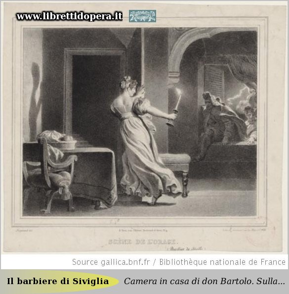 Scena prima Il momento dell'azione è sul terminar della notte. La scena rappresenta una piazza nella città di Siviglia. A sinistra è la casa di Bartolo con ringhiera praticabile circondata da gelosia che deve aprirsi, e chiudersi a suo tempo con chiave.