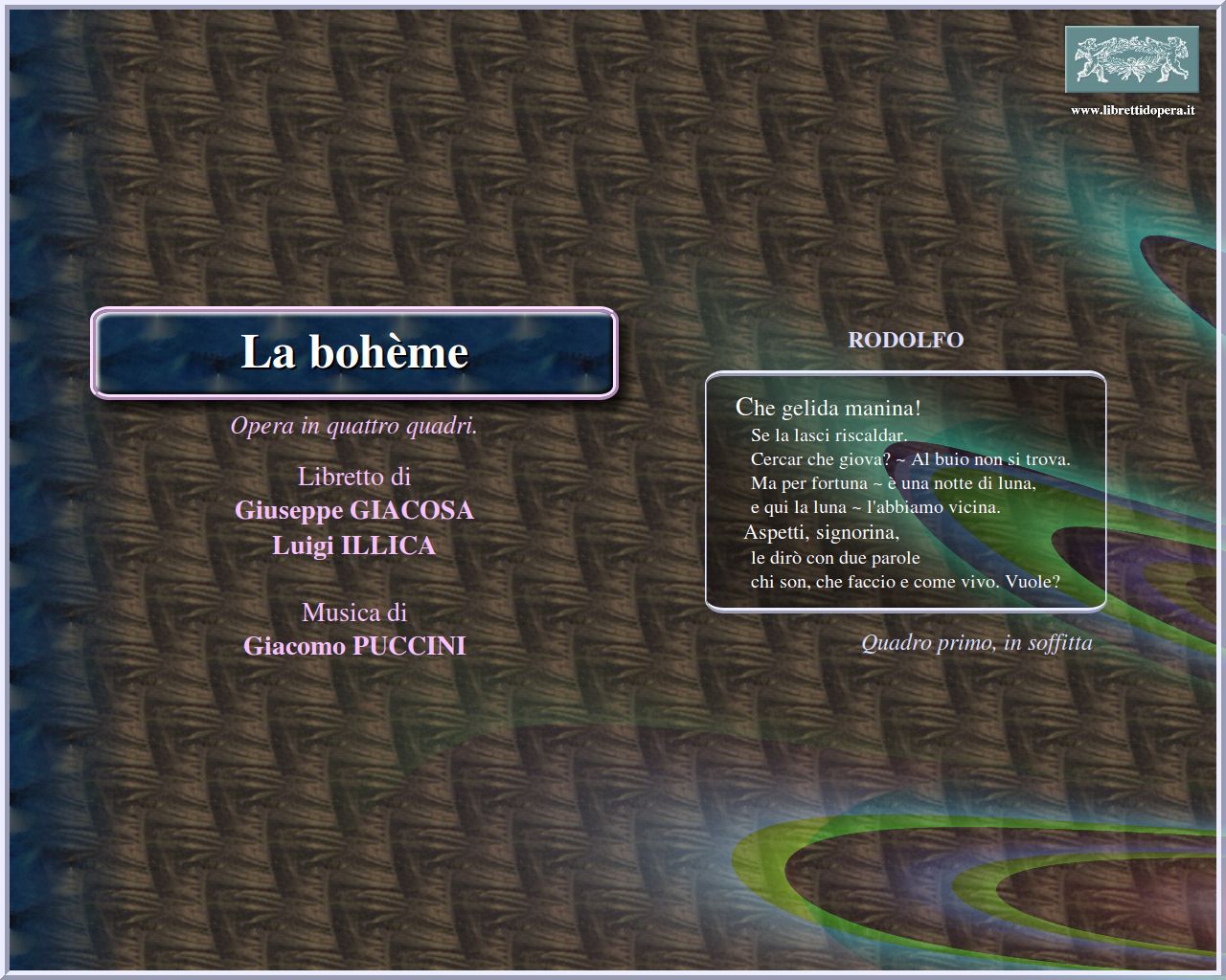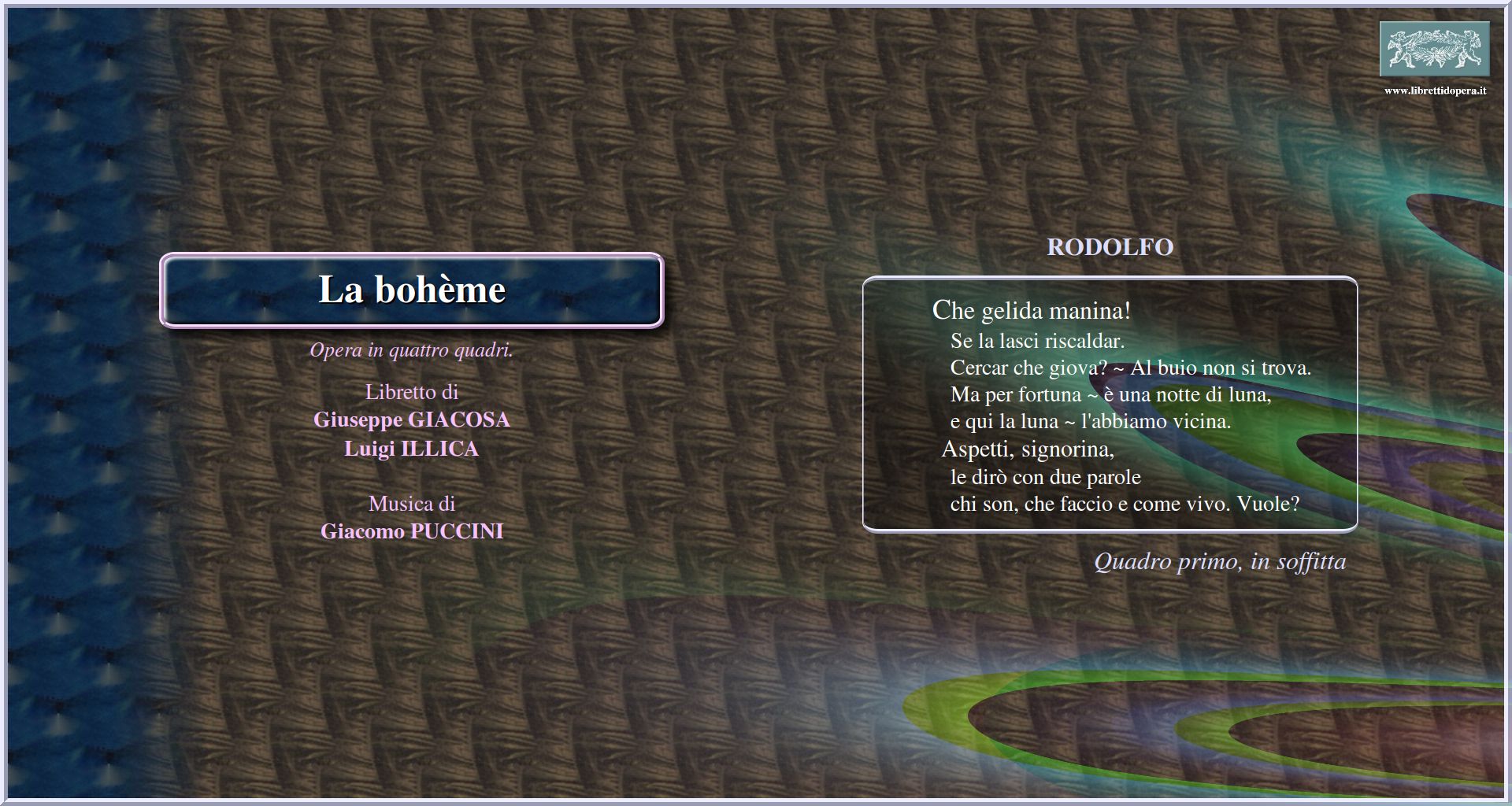 Mi chiamano Mimì Che gelida manina! Donde lieta uscì Sono andati? Fingevo di dormire Vecchia zimarra, senti