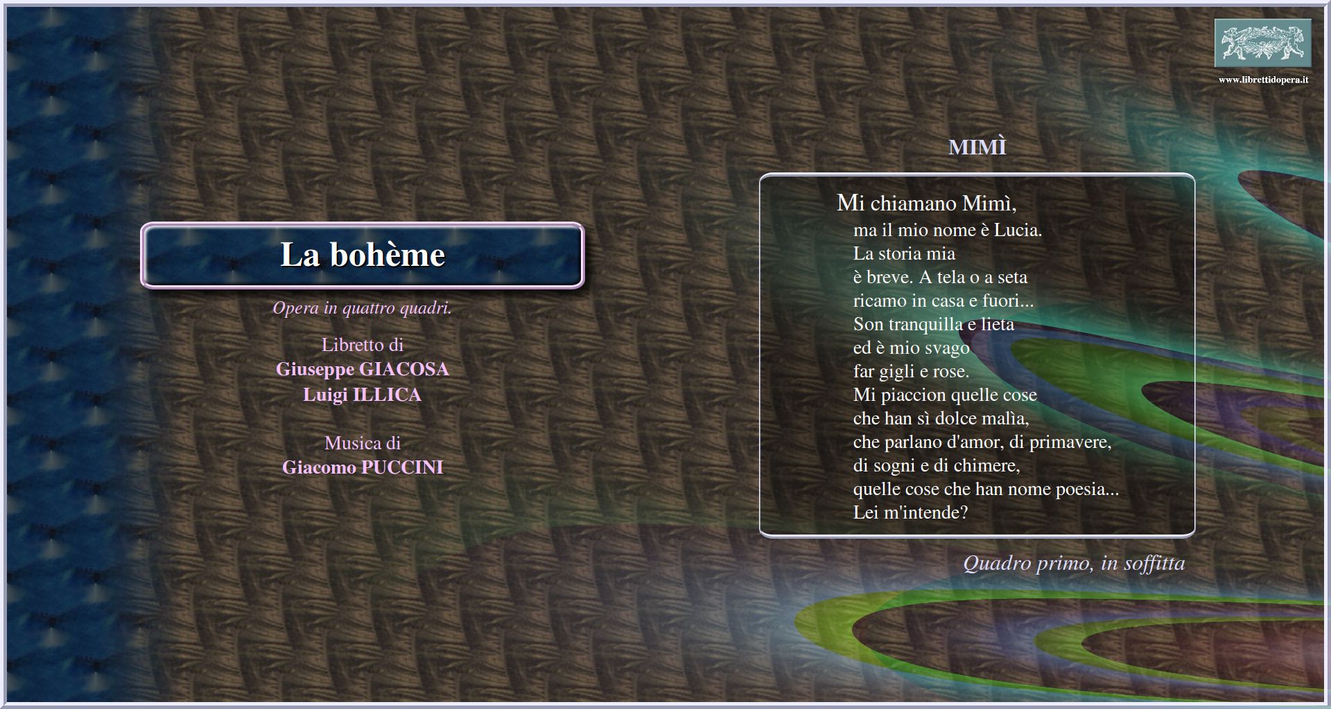 Mi chiamano Mimì Che gelida manina! Donde lieta uscì Sono andati? Fingevo di dormire Vecchia zimarra, senti