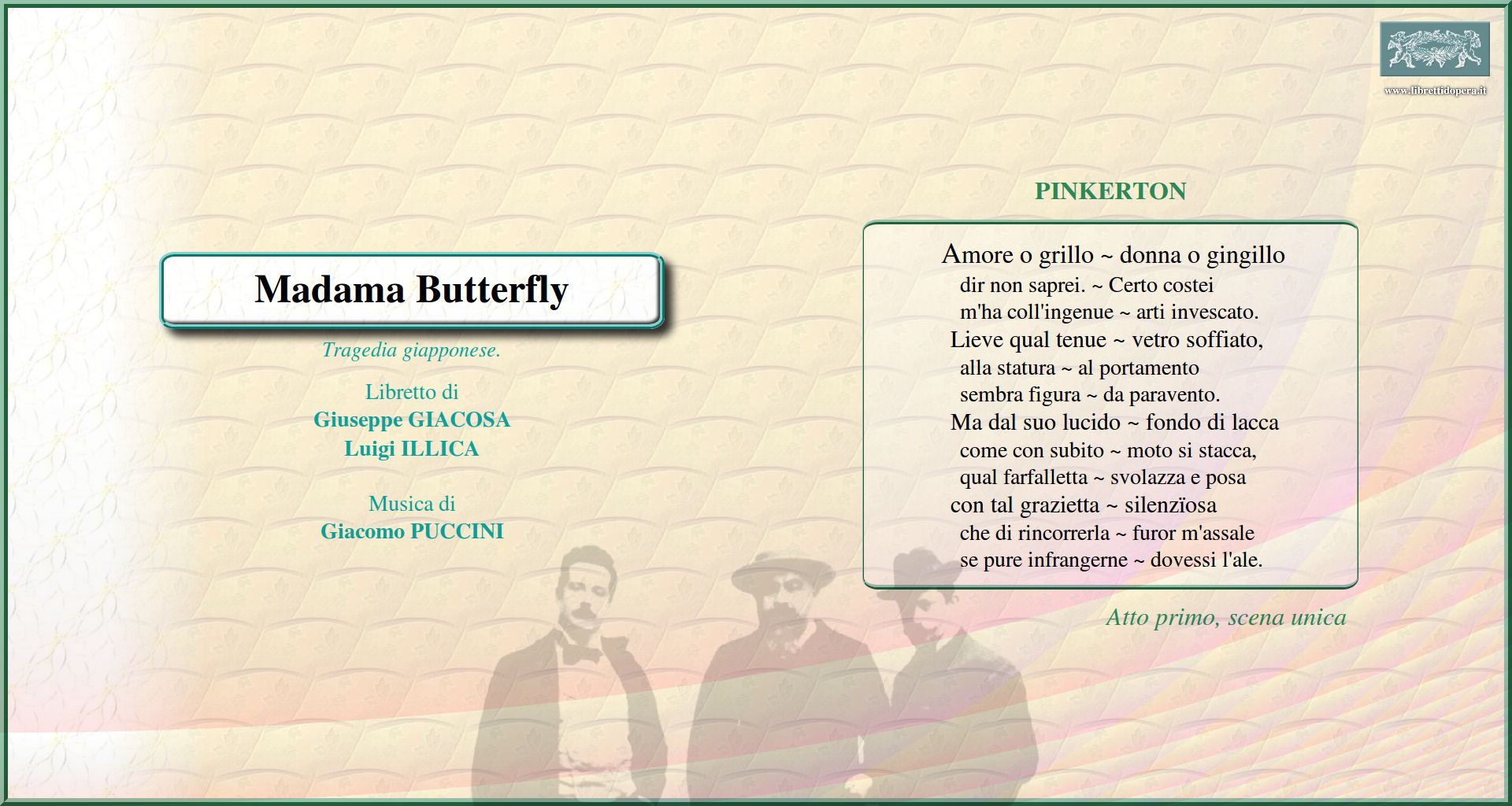 Spira sul mare Amore o grillo, donna o gingillo Seminiamo intorno april Vo' che mi veda indosso Un bel dì, vedremo Butterfly prende il bambino... Tu, tu piccolo iddio! Oh! l'amara fragranza