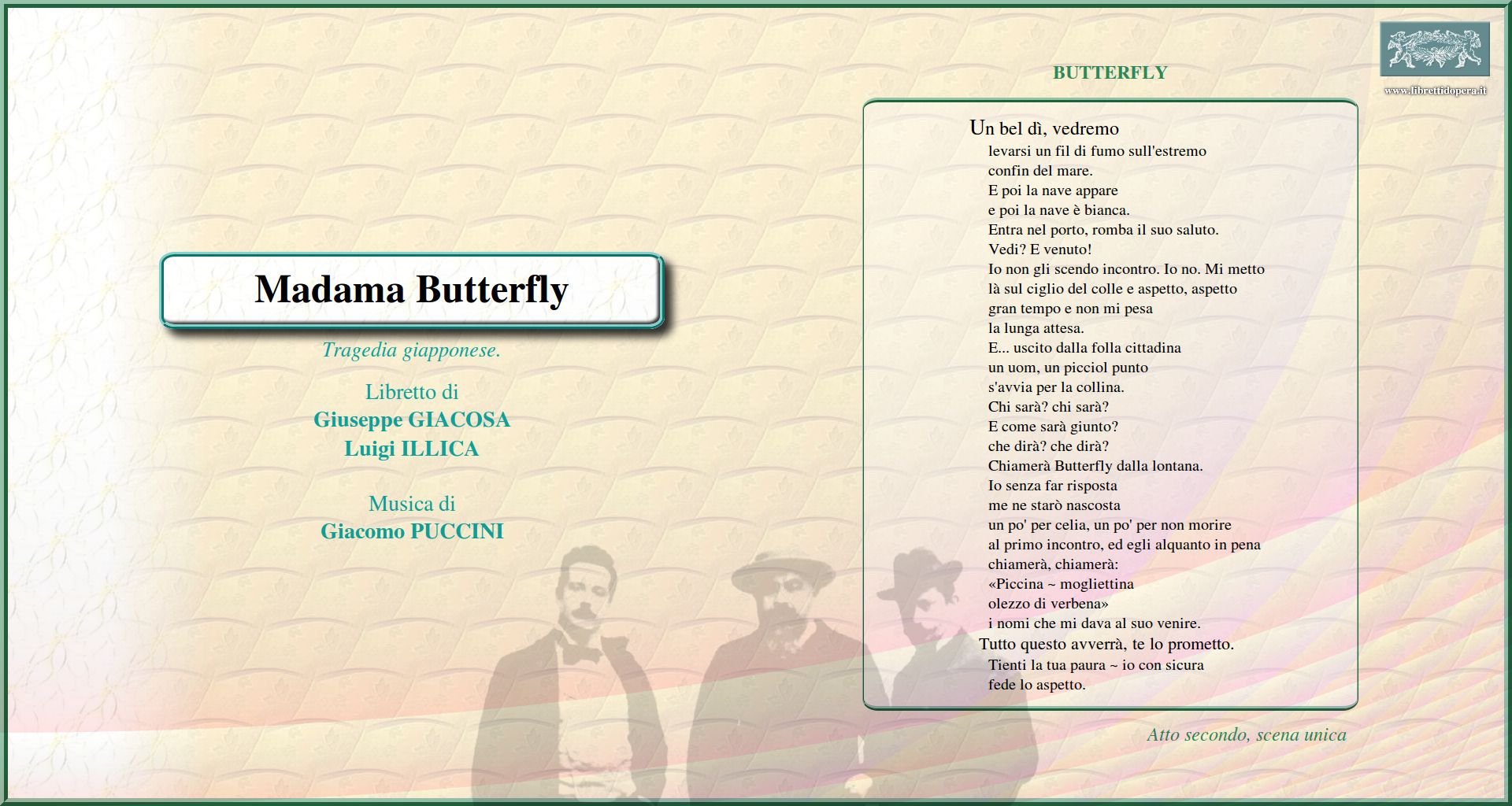 Spira sul mare Amore o grillo, donna o gingillo Seminiamo intorno april Vo' che mi veda indosso Un bel dì, vedremo Butterfly prende il bambino... Tu, tu piccolo iddio! Oh! l'amara fragranza