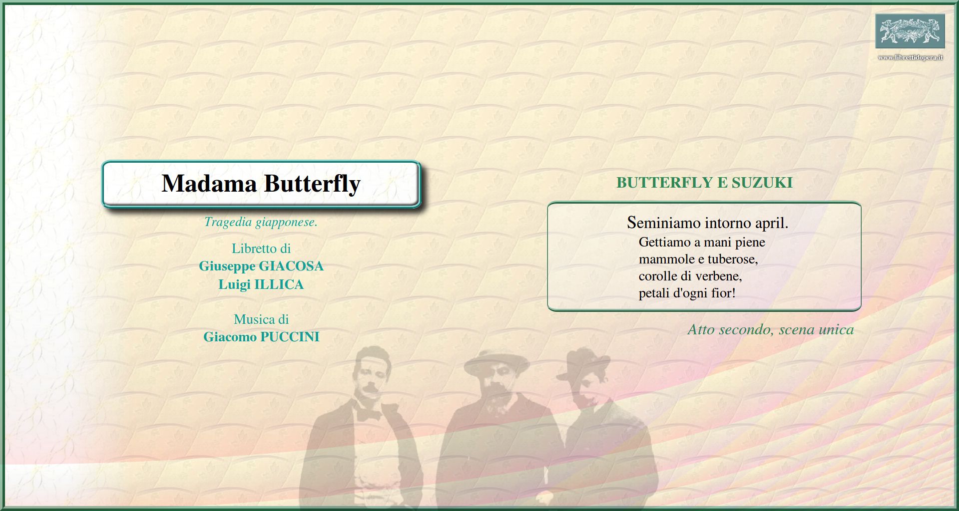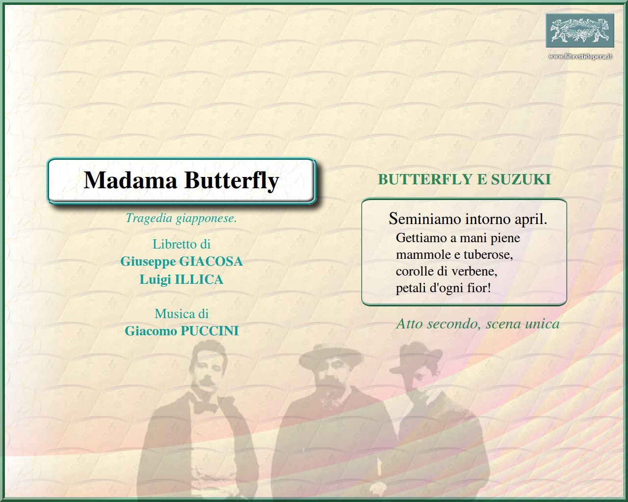 Spira sul mare Amore o grillo, donna o gingillo Seminiamo intorno april Vo' che mi veda indosso Un bel dì, vedremo Butterfly prende il bambino... Tu, tu piccolo iddio! Oh! l'amara fragranza