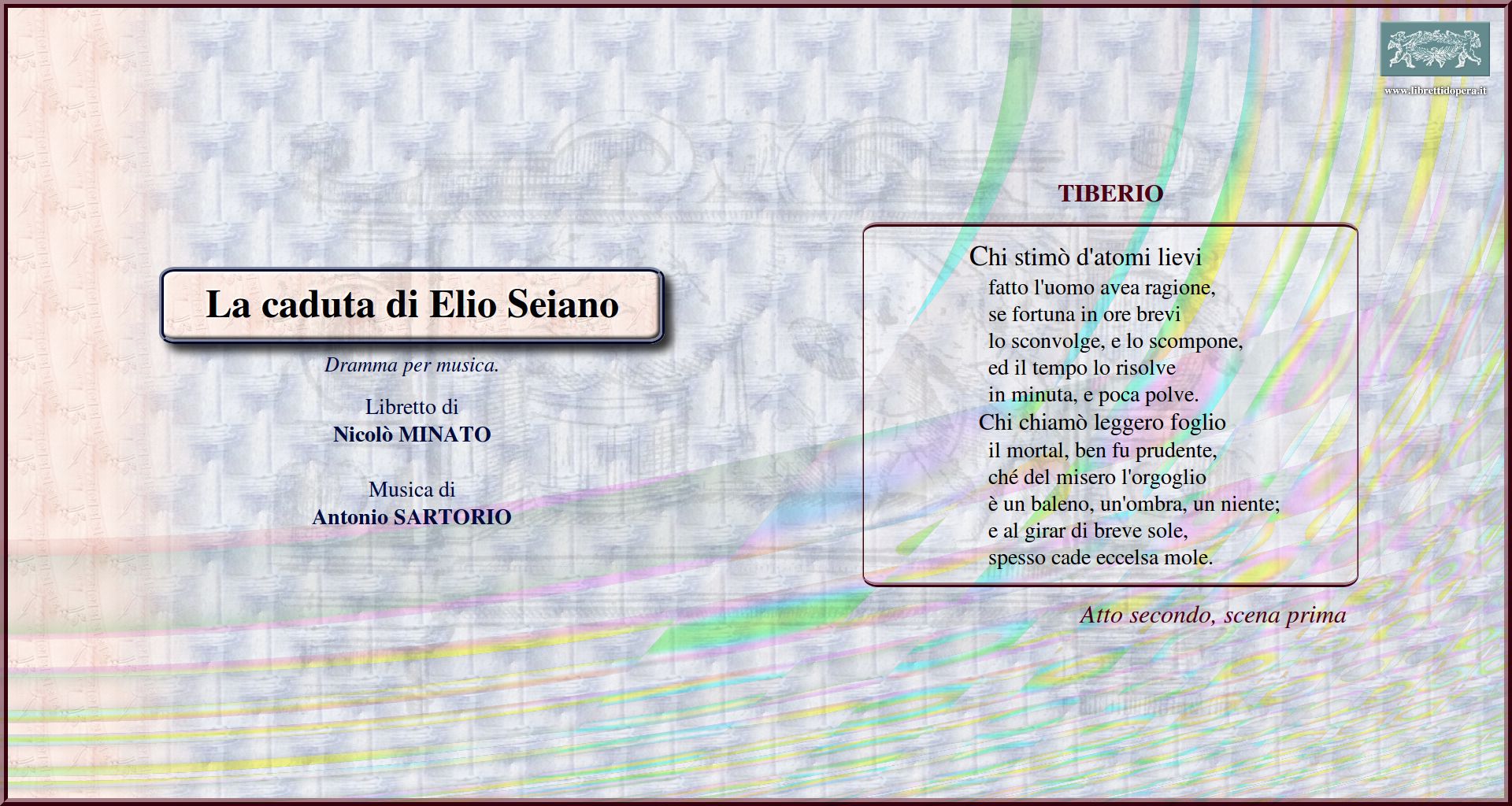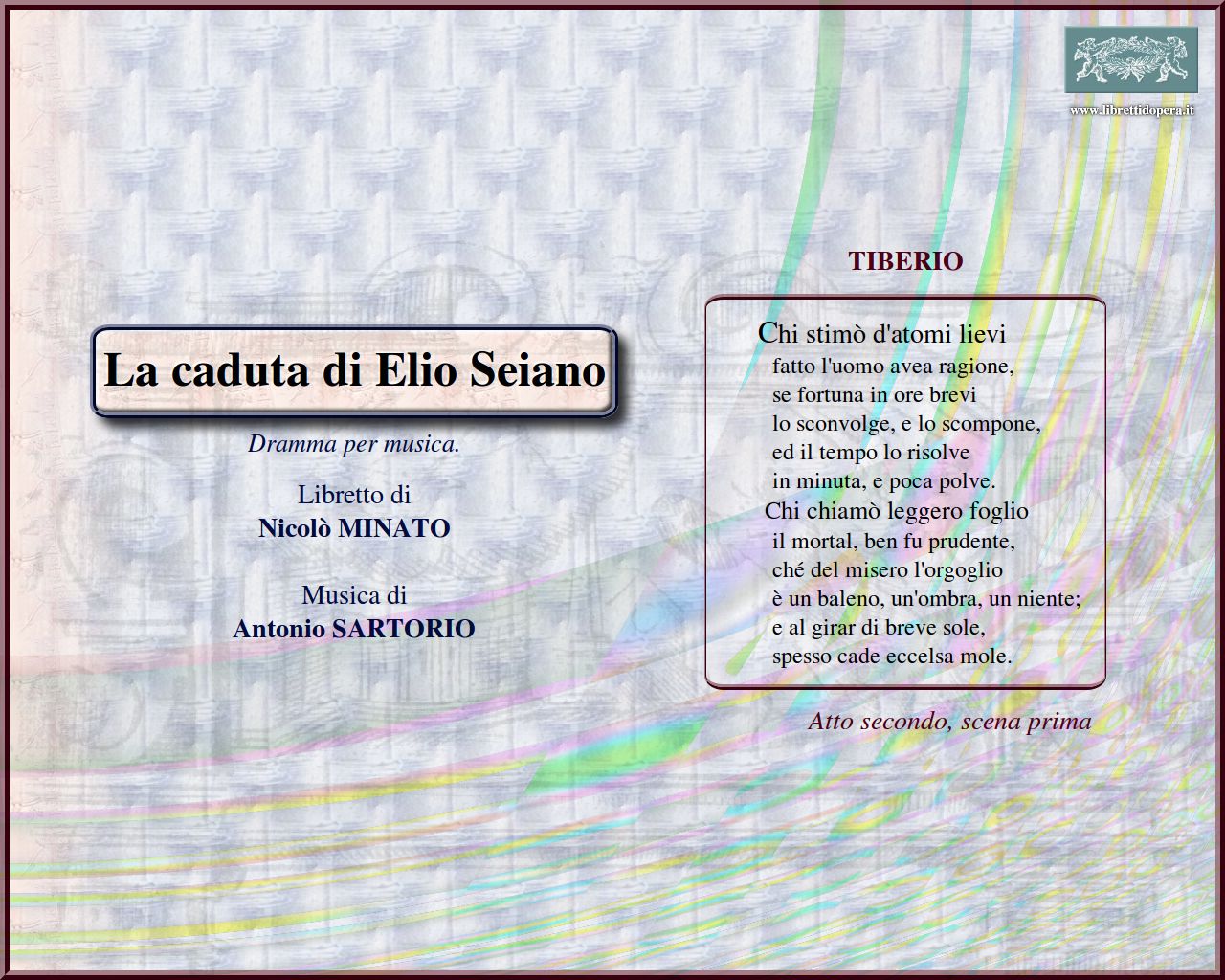 La fiamma d'amore S'il picciolo dio È una luce di baleno Chi stimò d'atomi lievi Fantasmi noiosi A te ricorro, a te Se i pianti non giovano Socchiusi pugnino