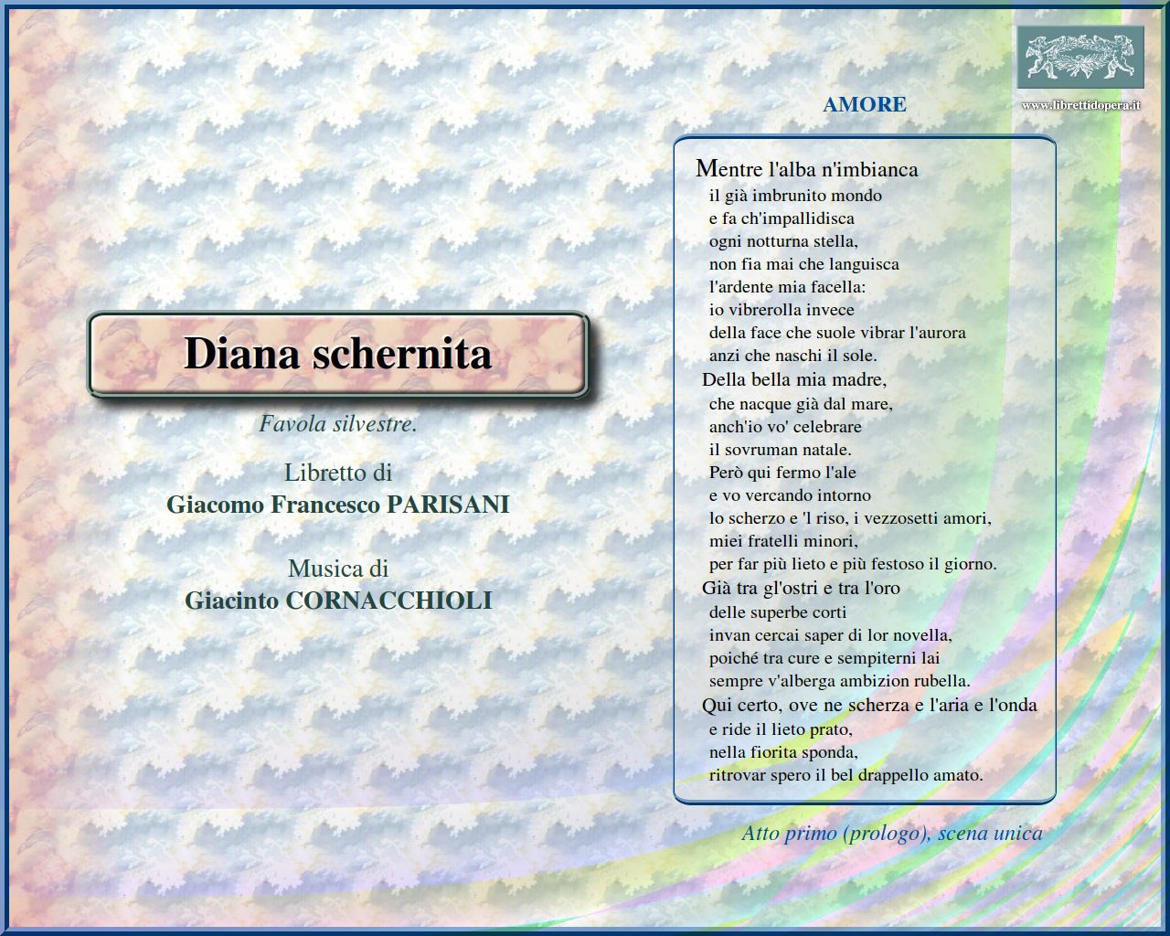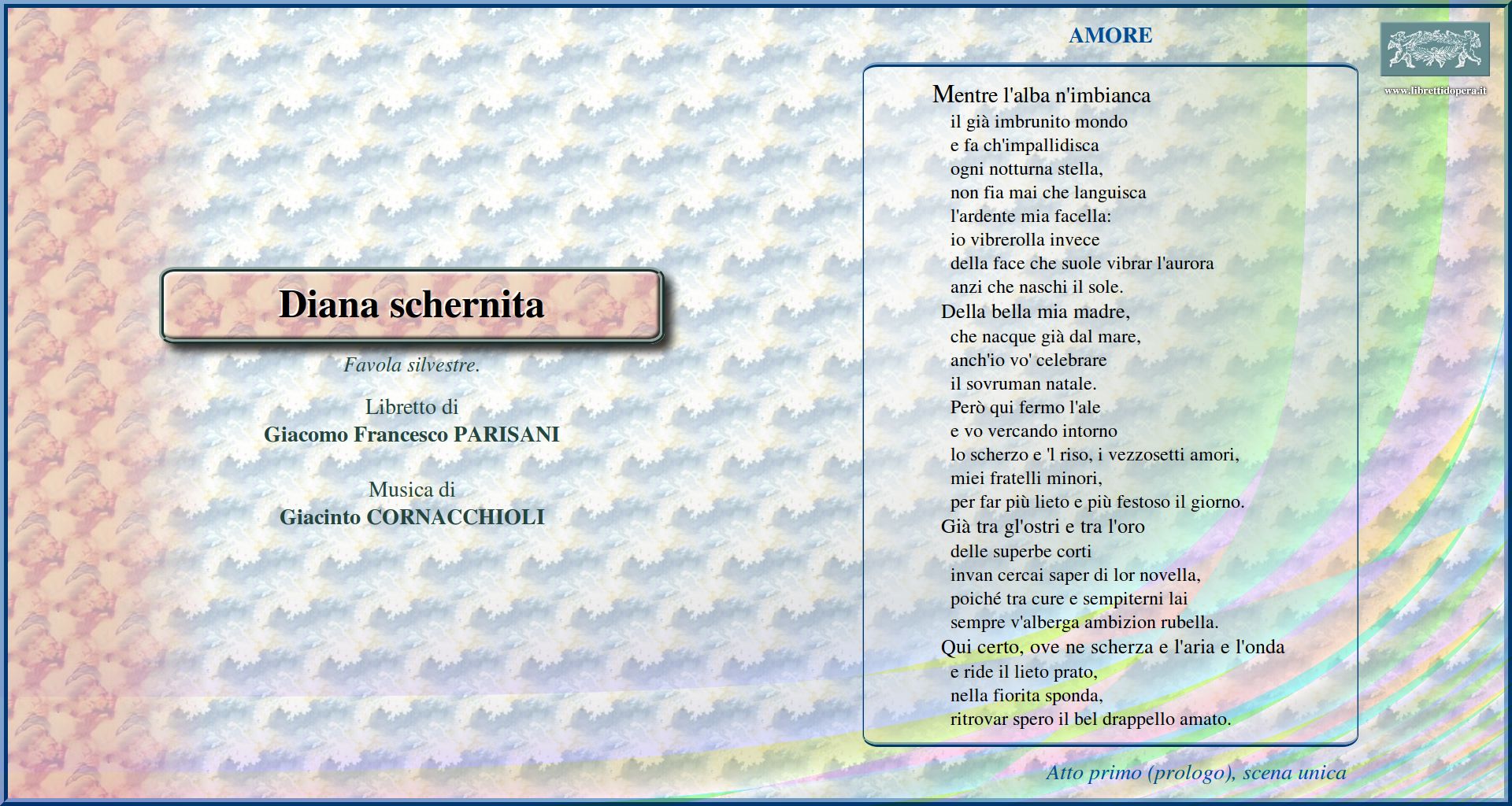 Mentre l'alba n'imbianca Della candida dea il più bel fiore Gran pianeta del ciel, occhio del giorno O Delia, Cinzia Ecco già sussurrando