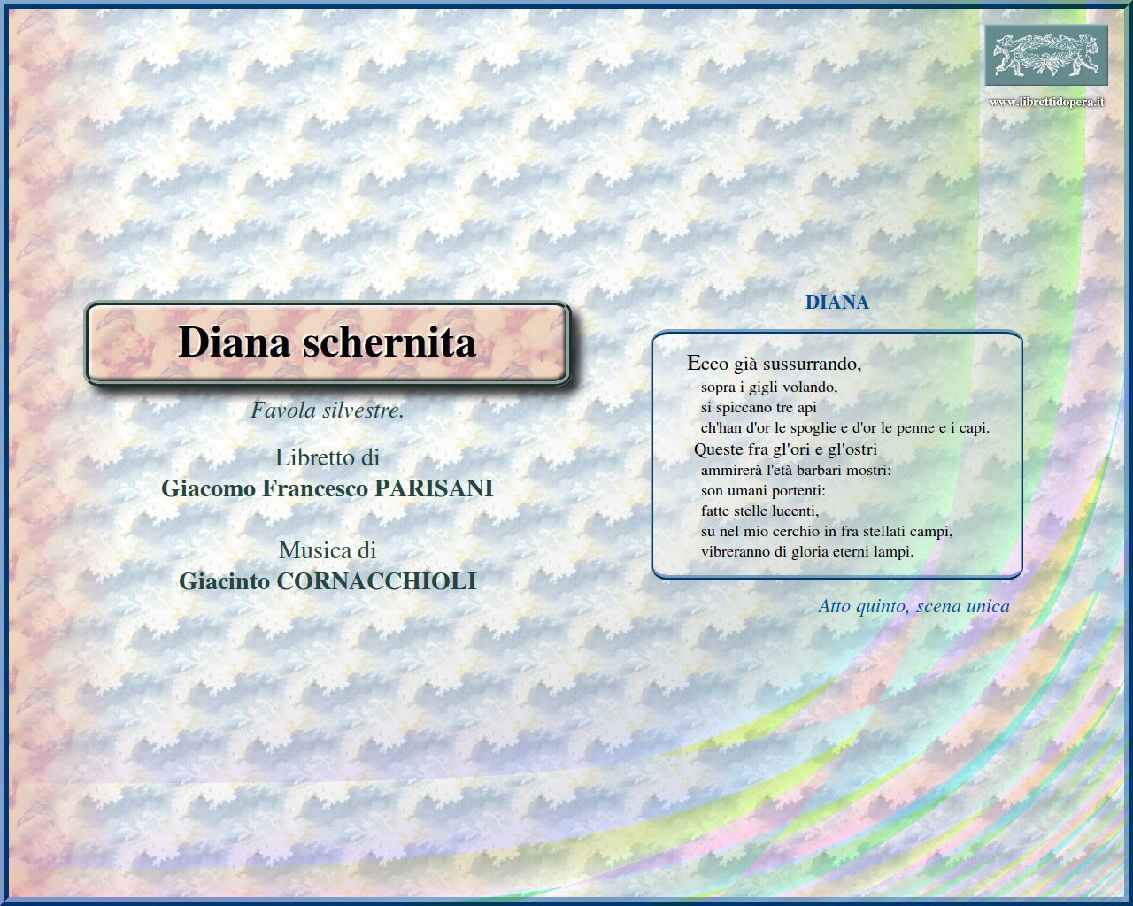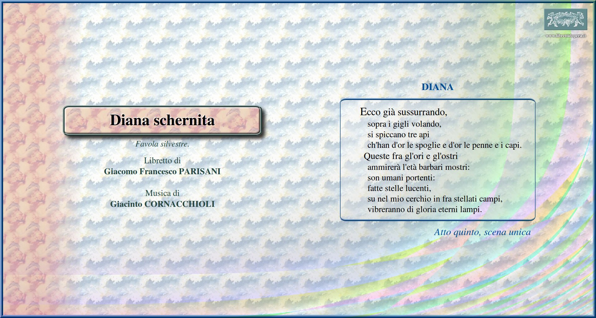 Mentre l'alba n'imbianca Della candida dea il più bel fiore Gran pianeta del ciel, occhio del giorno O Delia, Cinzia Ecco già sussurrando