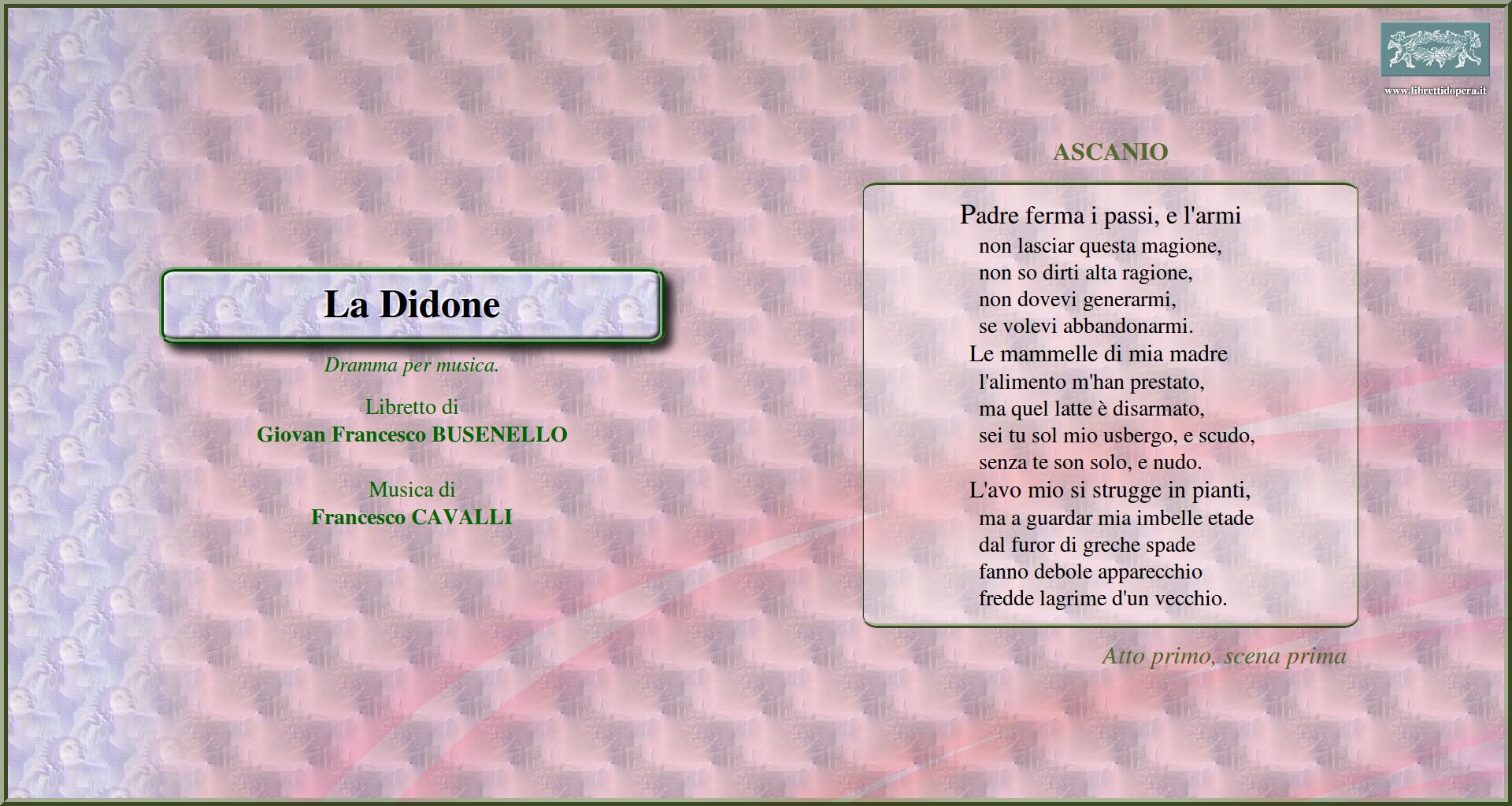 E poiché nulla curi i regni miei Padre ferma i passi, e l'armi Perdonatemi, o stelle, ancorché d'oro Chi ti diss'io Un bel viso innamora Vanne, ch'io qui delibero Porgetemi la spada