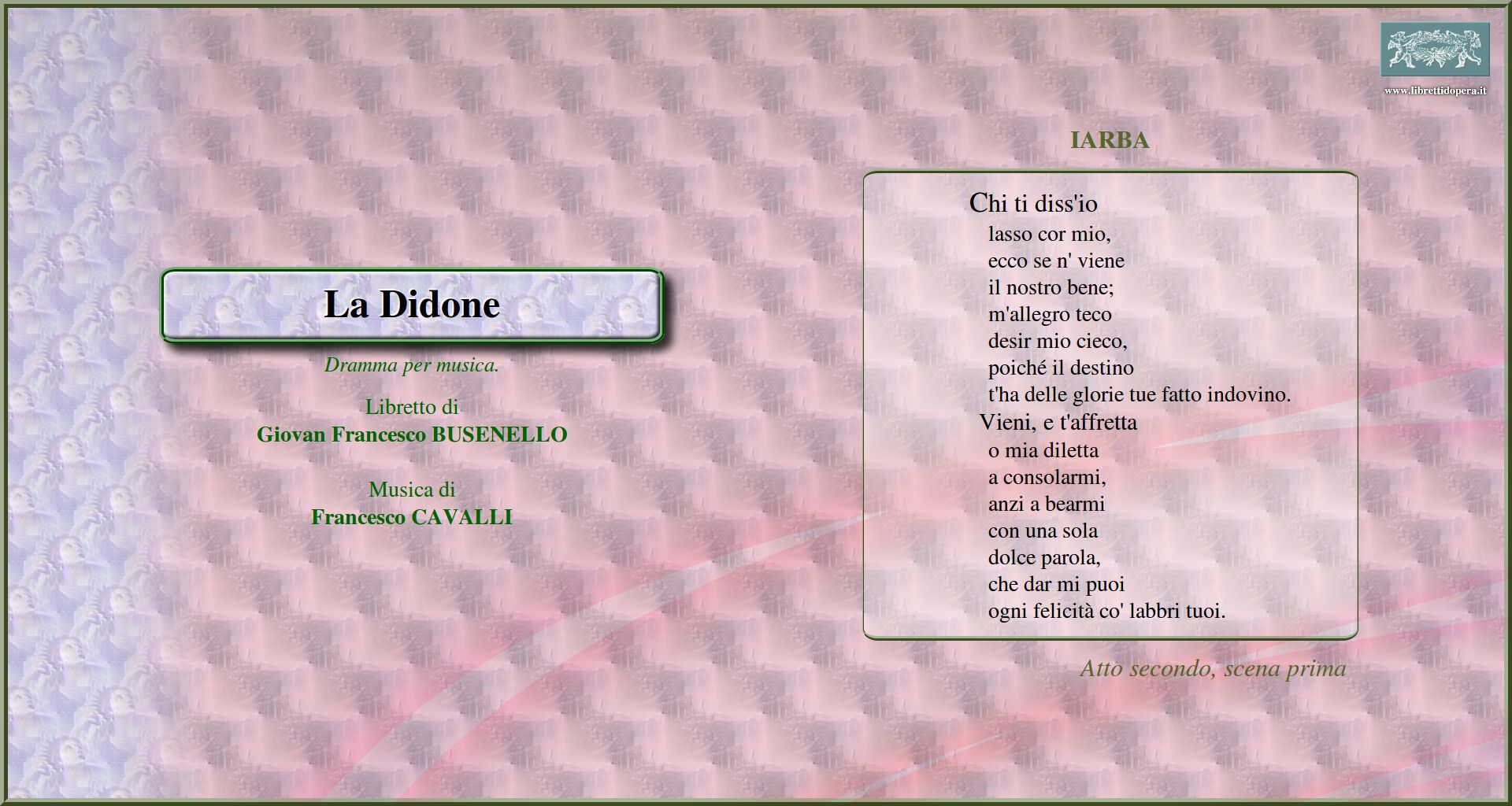E poiché nulla curi i regni miei Padre ferma i passi, e l'armi Perdonatemi, o stelle, ancorché d'oro Chi ti diss'io Un bel viso innamora Vanne, ch'io qui delibero Porgetemi la spada
