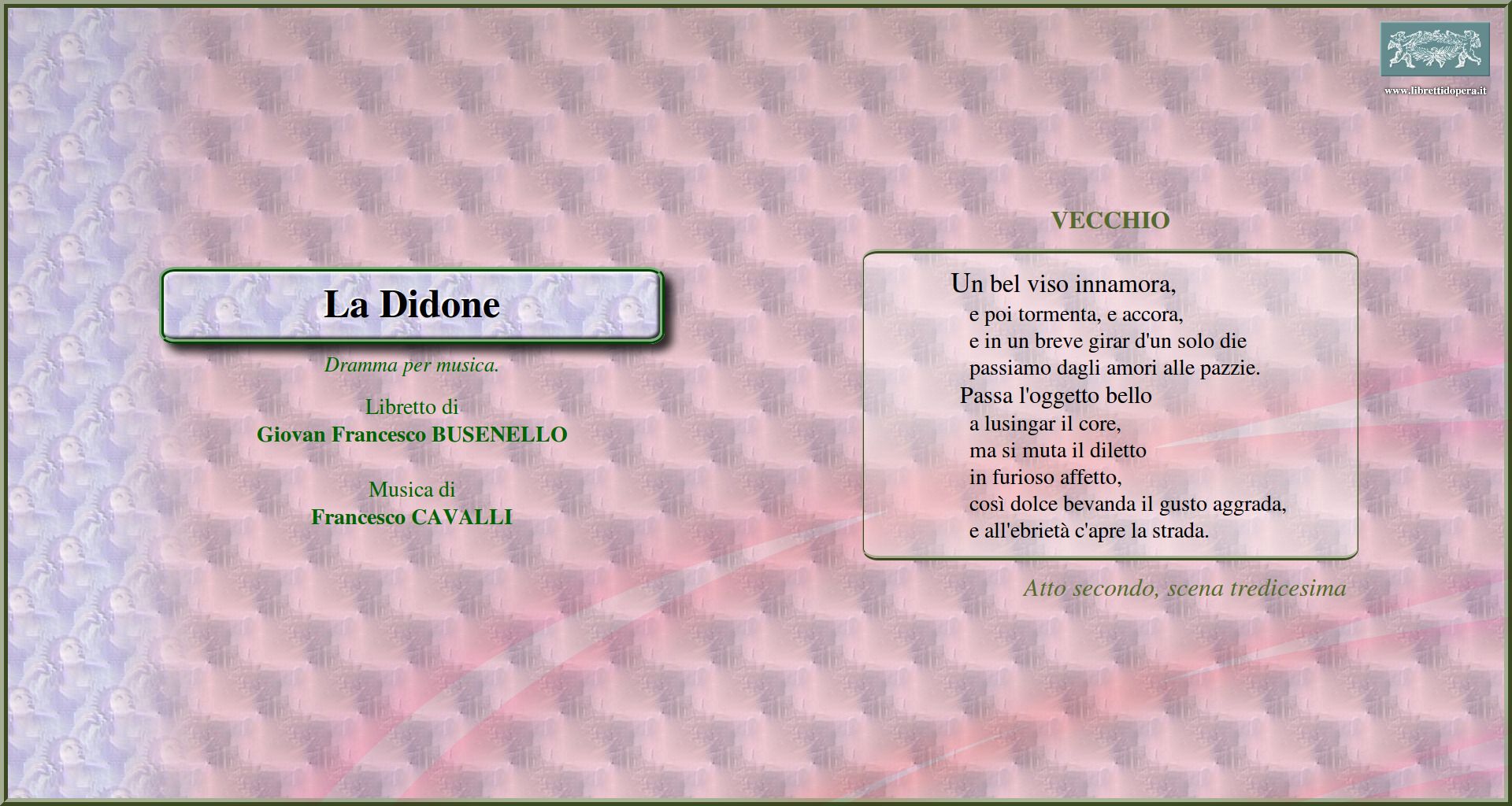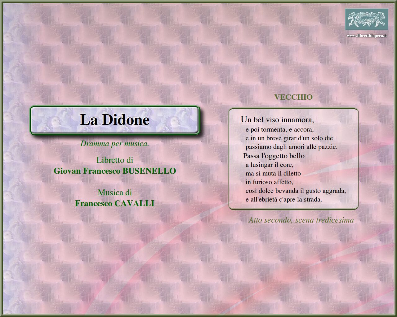 E poiché nulla curi i regni miei Padre ferma i passi, e l'armi Perdonatemi, o stelle, ancorché d'oro Chi ti diss'io Un bel viso innamora Vanne, ch'io qui delibero Porgetemi la spada