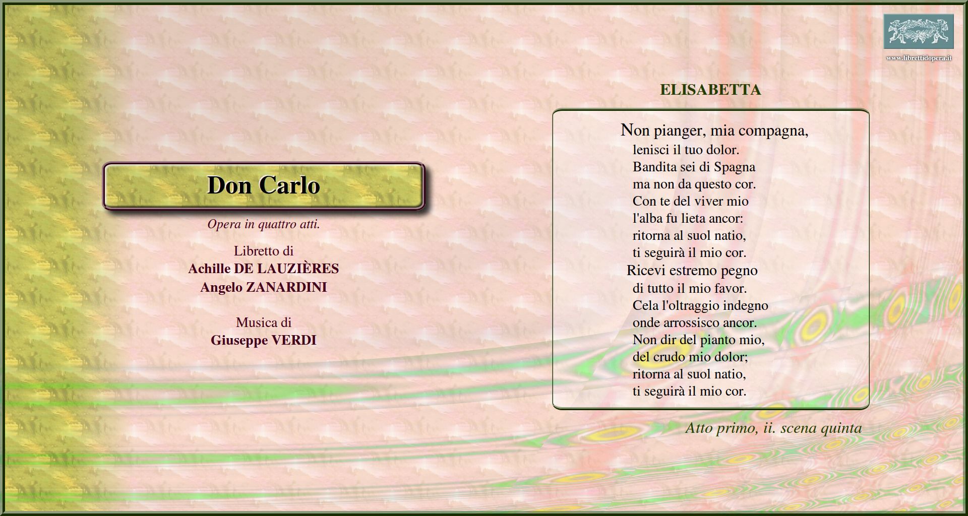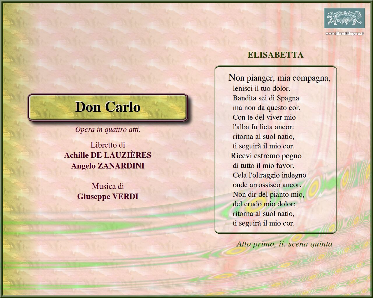 Ah! Il ciel s'illuminò, la selva rifiorì! Non pianger, mia compagna Trema per te, falso figliuolo Dormirò sol nel manto mio regal O don fatale, o don crudel Per me giunto è il dì supremo Tu che le vanità conoscesti del mondo