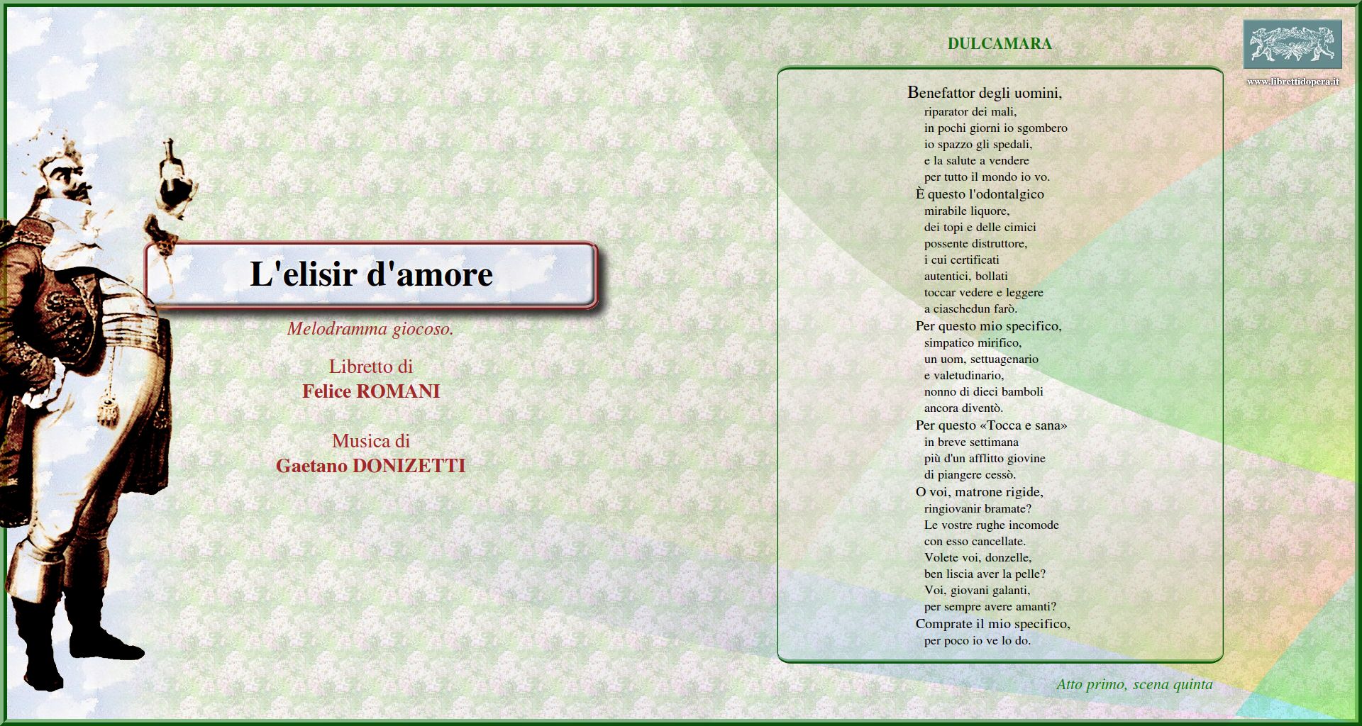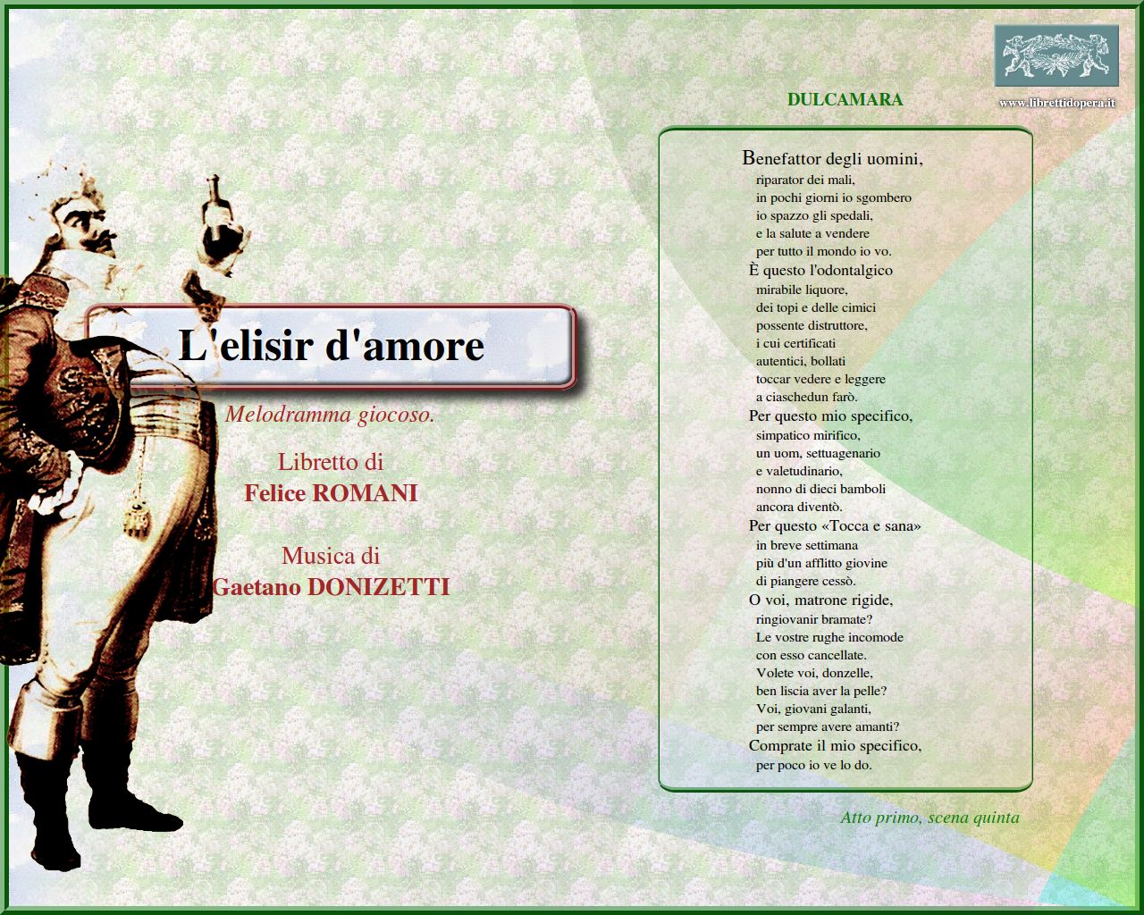 Quanto è bella, quanto è cara! Come Paride vezzoso Chiedi al rio perché gemente Benefattor degli uomini Cantiamo ancora un brindisi Ai perigli della guerra Una tenera occhiatina Una furtiva lagrima
