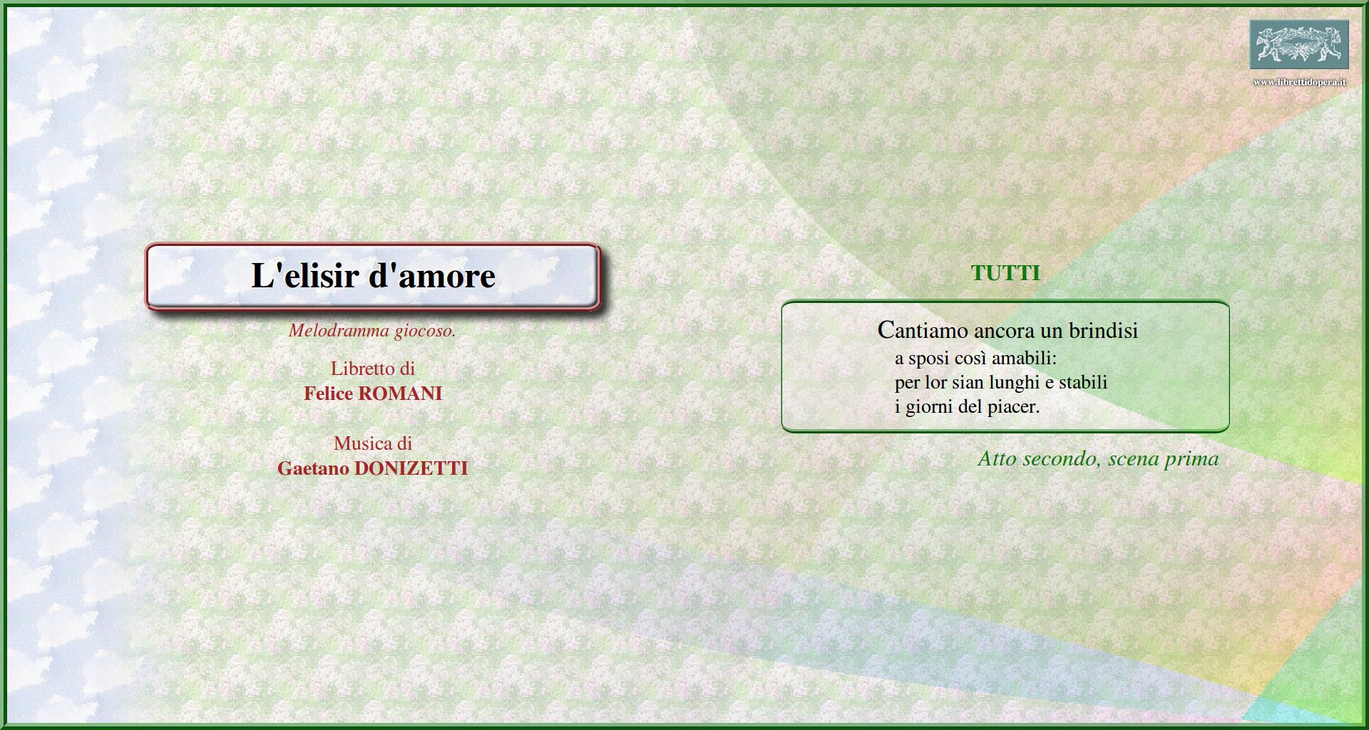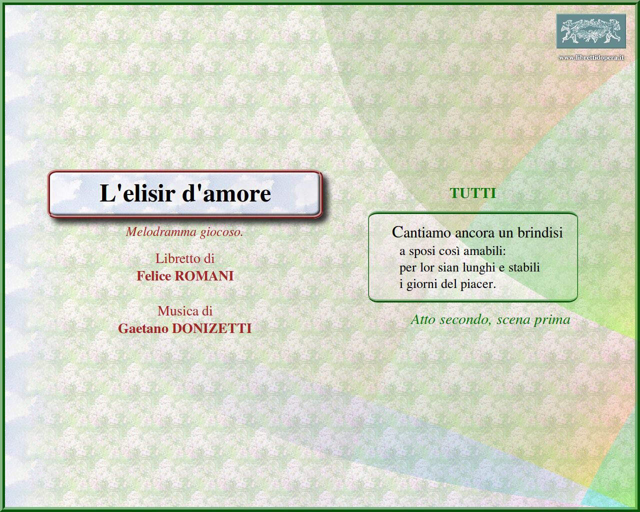 Quanto è bella, quanto è cara! Come Paride vezzoso Chiedi al rio perché gemente Benefattor degli uomini Cantiamo ancora un brindisi Ai perigli della guerra Una tenera occhiatina Una furtiva lagrima